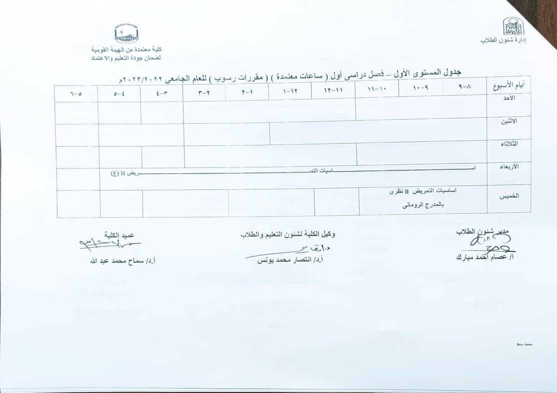 جدول المستوى الأول – فصل دراسي أول (ساعات معتمدة) (مقررات رسوب) للعام الجامعي2022-2023م 27 سبتمبر 2022