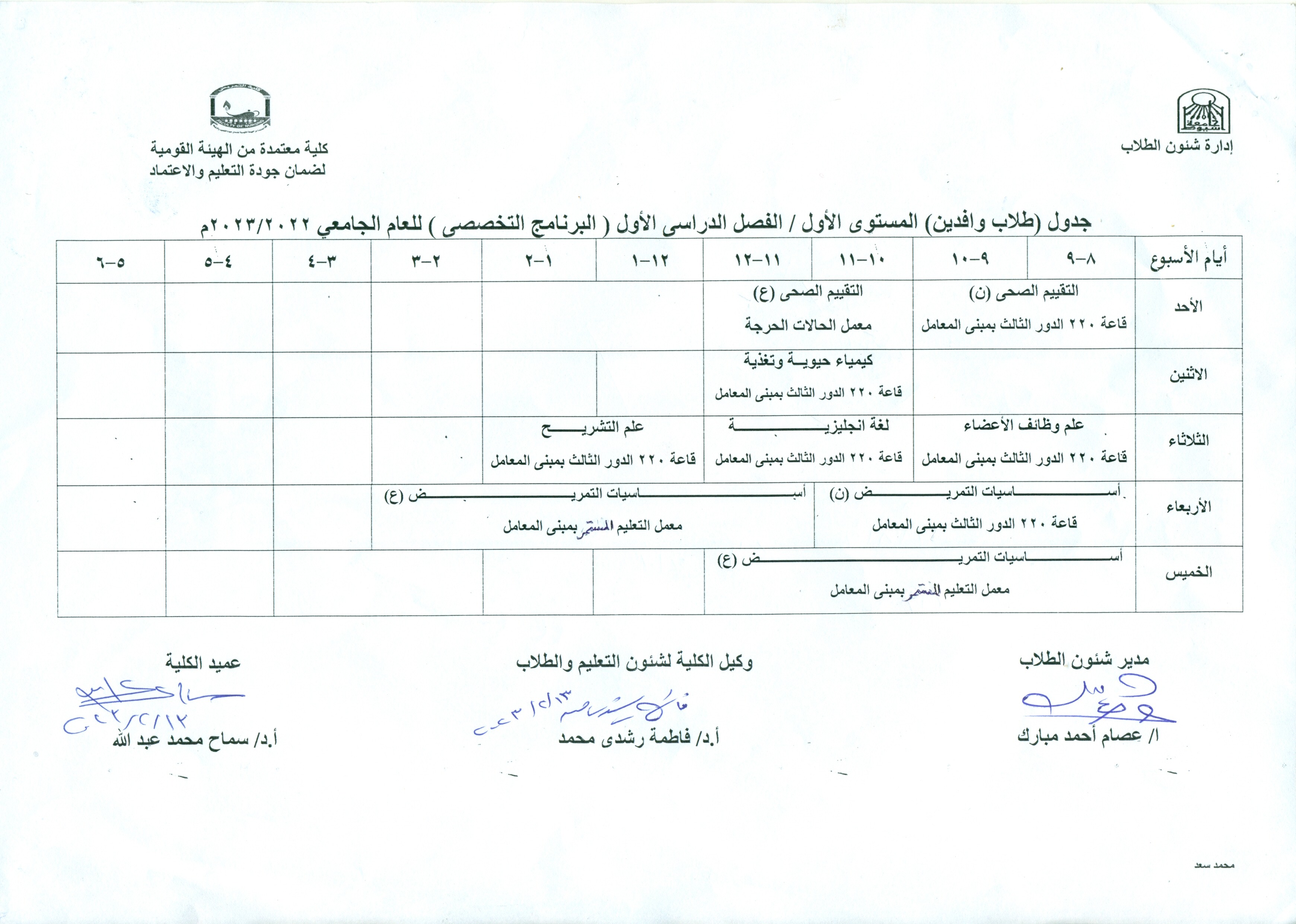 جدول المستوي الأول (طلاب وافدين) (البرنامج التخصصي) الفصل الدراسي الثاني للعام الجامعي 2022-2023م 16 فبراير 2023