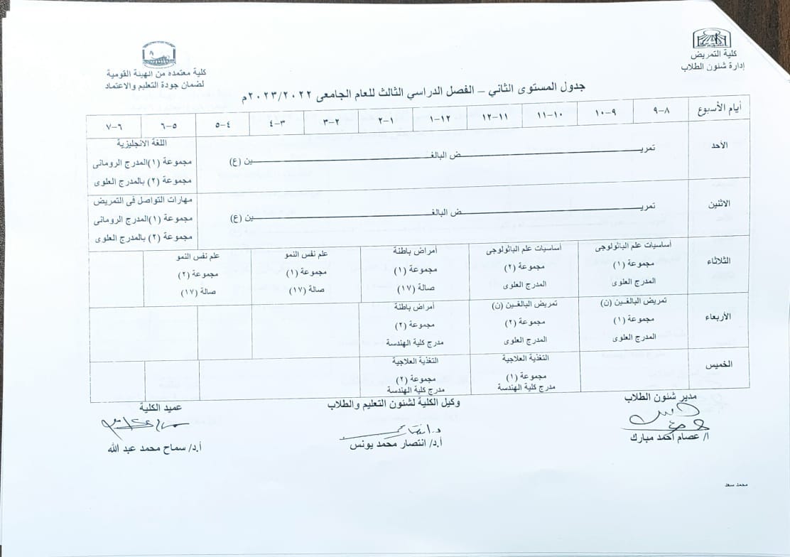 جدول المستوى الثاني- الفصل الدراسي الثالث للعام الجامعي 2023/2022م