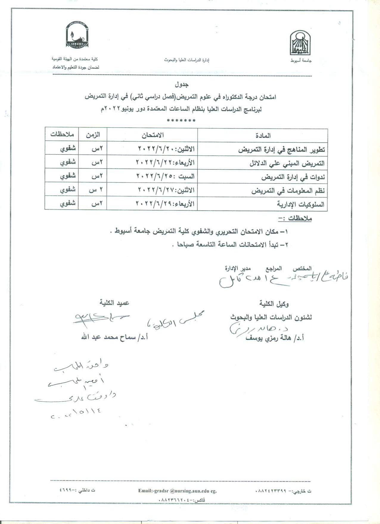 جدول امتحان درجة الدكتوراه فى علوم التمريض (إدارة التمريض) فصل دراسي ثاني لبرنامج الدراسات العليا بنظام الساعات المعتمدة دور يونيو 2022م 30 مايو 2022