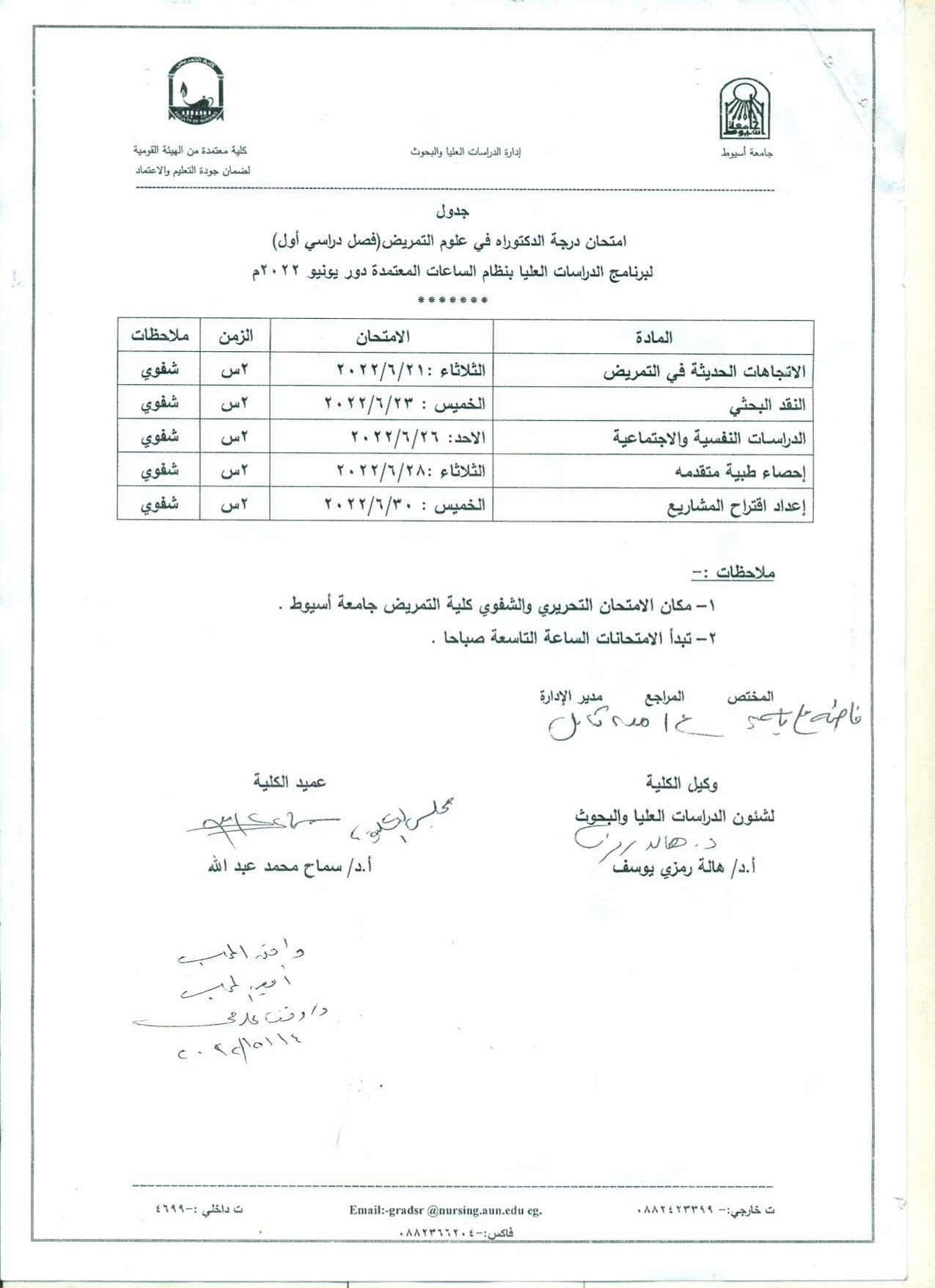 جدول امتحان درجة الدكتوراه فى علوم التمريض (فصل دراسي أول) لبرنامج الدراسات العليا بنظام الساعات المعتمدة دور يونيو 2022م 30 مايو 2022