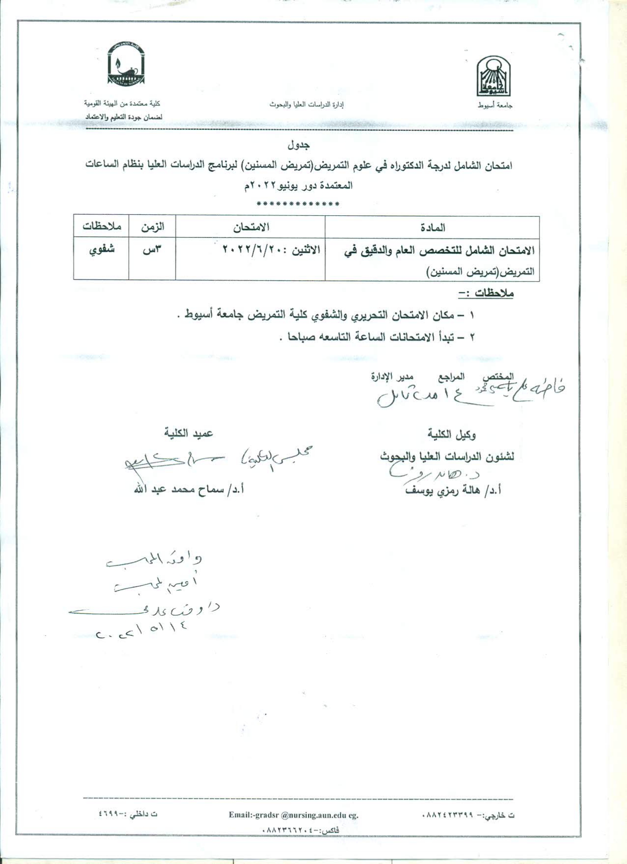 جدول امتحان درجة الدكتوراه فى علوم التمريض (تمريض المسنين) لبرنامج الدراسات العليا بنظام الساعات المعتمدة دور يونيو 2022م 30 مايو 2022