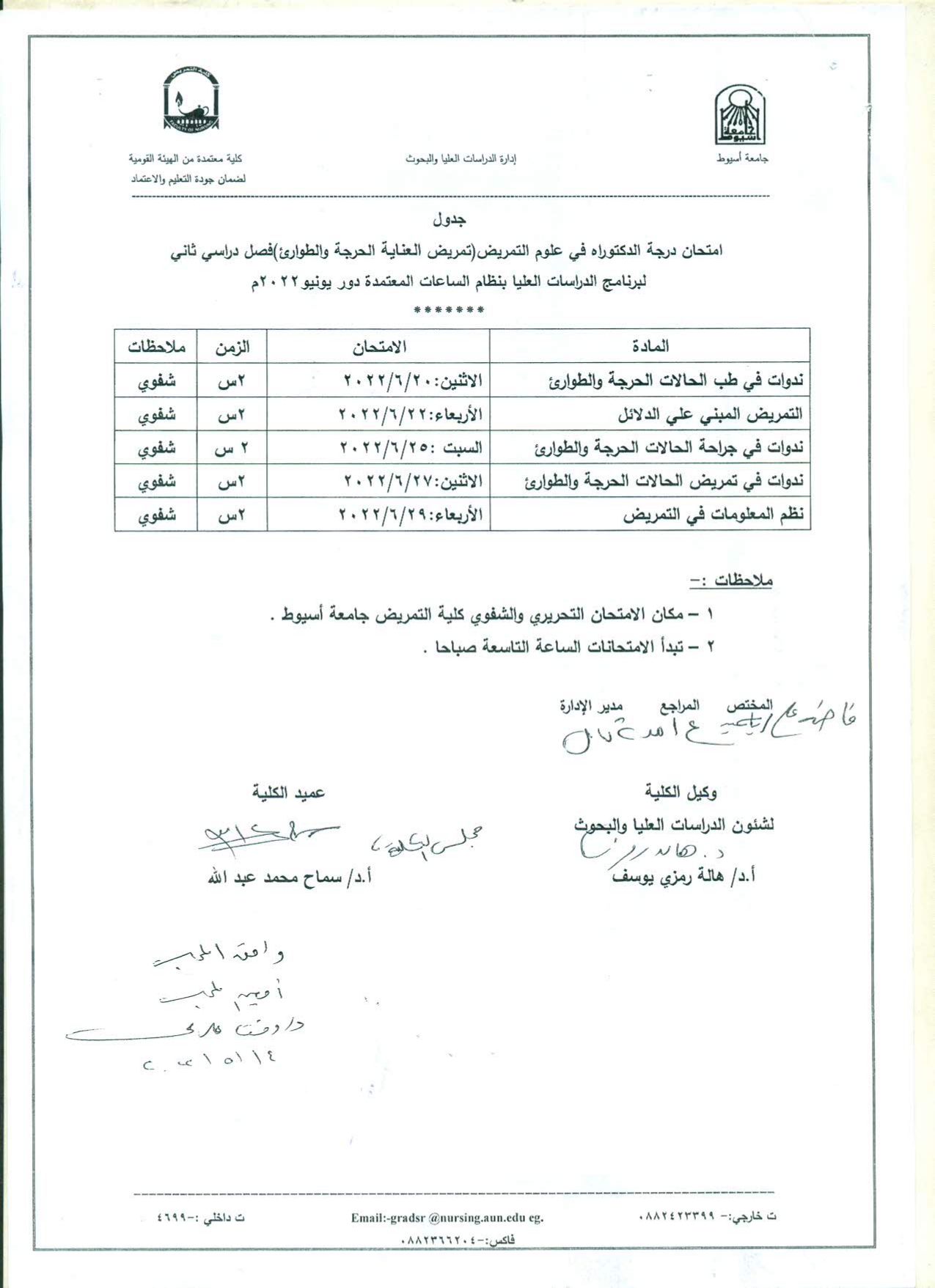 جدول امتحان درجة الدكتوراه فى علوم التمريض (تمريض العناية الحرجة والطوارئ) فصل دراسي ثاني لبرنامج الدراسات العليا بنظام الساعات المعتمدة دور يونيو 2022م