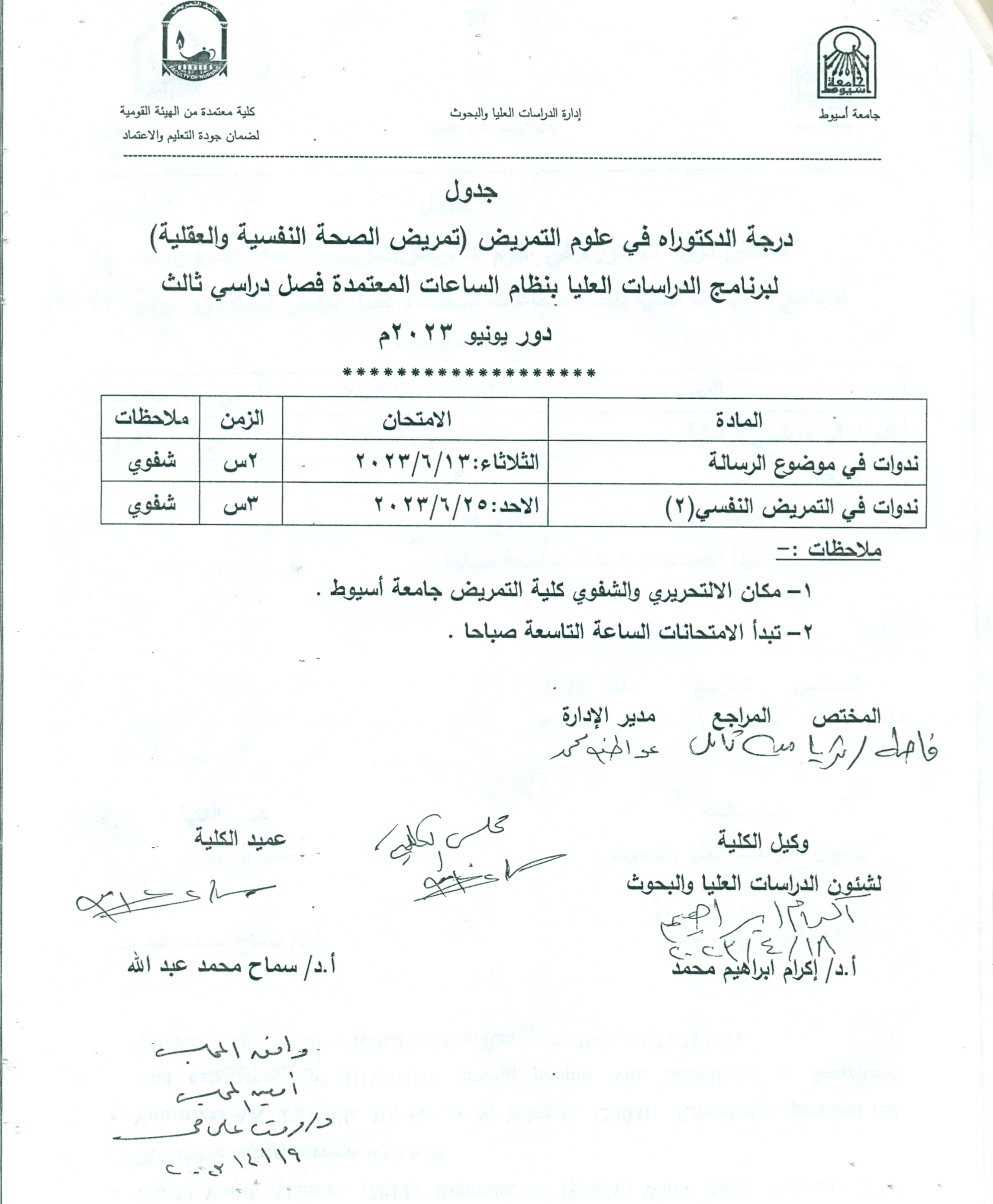 جدول امتحان درجة الدكتوراه في علوم التمريض (تمريض الصحة النفسية والعقلية) لبرنامج الدراسات العليا بنظام الساعات المعتمدة فصل دراسي ثالث دور يونيو 2023م