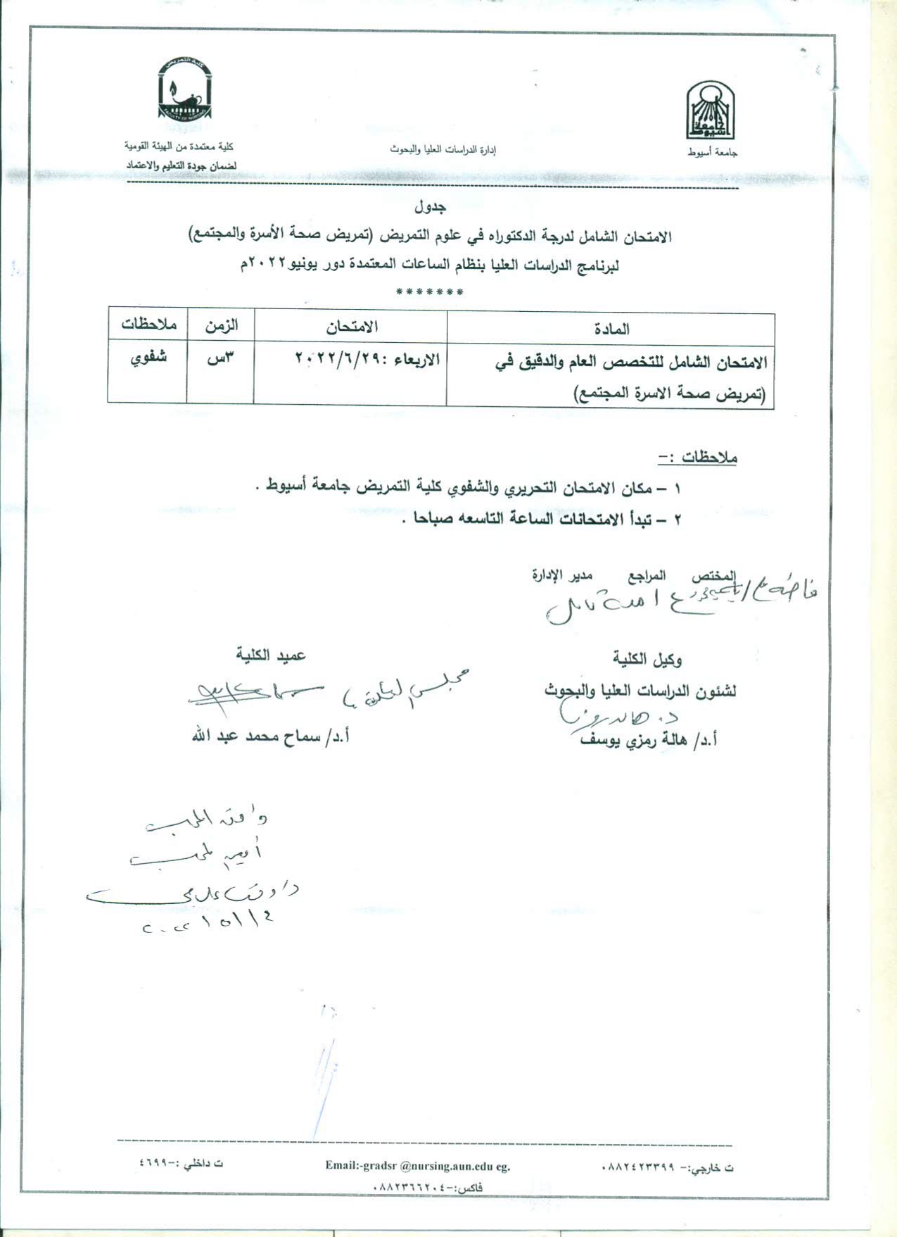 جدول امتحان درجة الدكتوراه فى علوم التمريض (تمريض صحة االأسرة والمجتمع) لبرنامج الدراسات العليا بنظام الساعات المعتمدة دور يونيو 2022م 30 مايو 2022
