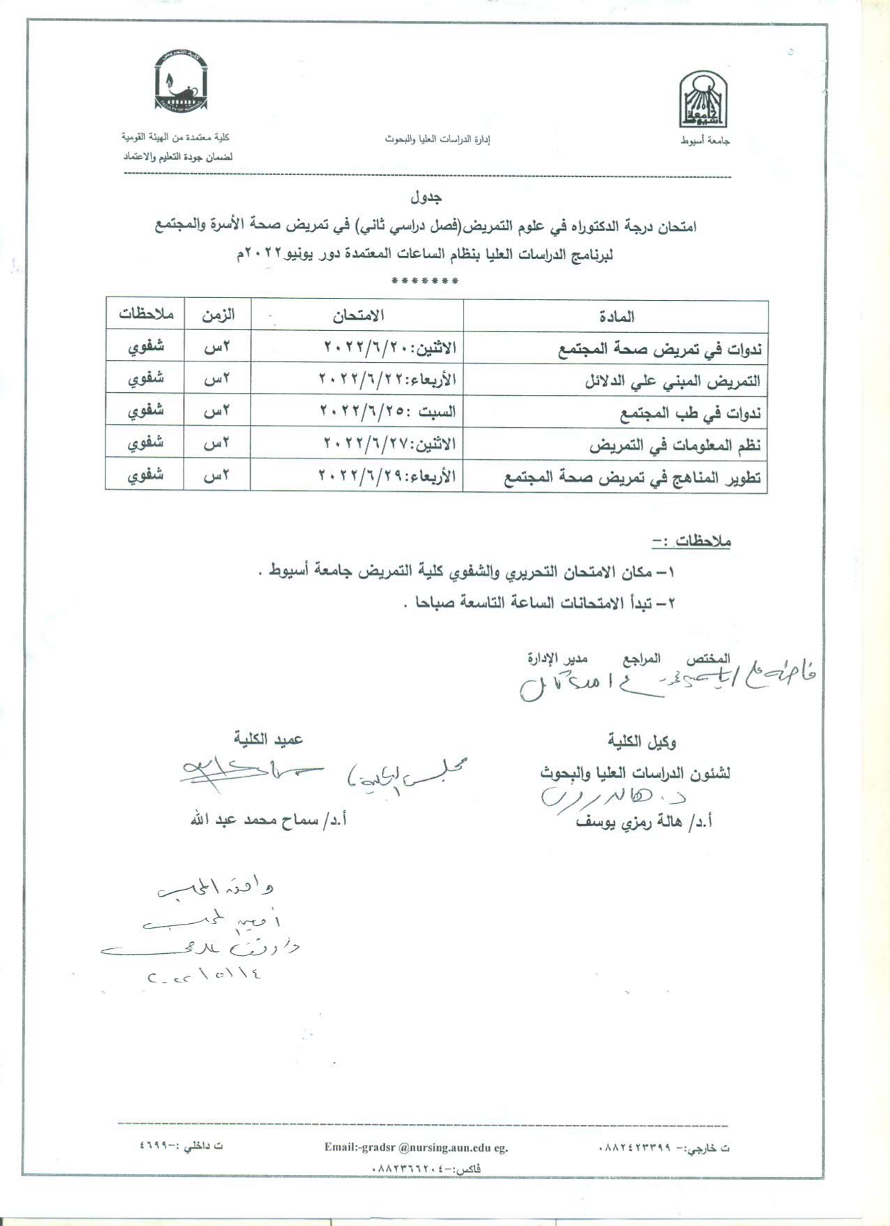 جدول امتحان درجة الدكتوراه فى علوم التمريض (تمريض صحة الأسرة والمجتمع) فصل دراسي ثاني لبرنامج الدراسات العليا بنظام الساعات المعتمدة دور يونيو 2022م 30 مايو 2022