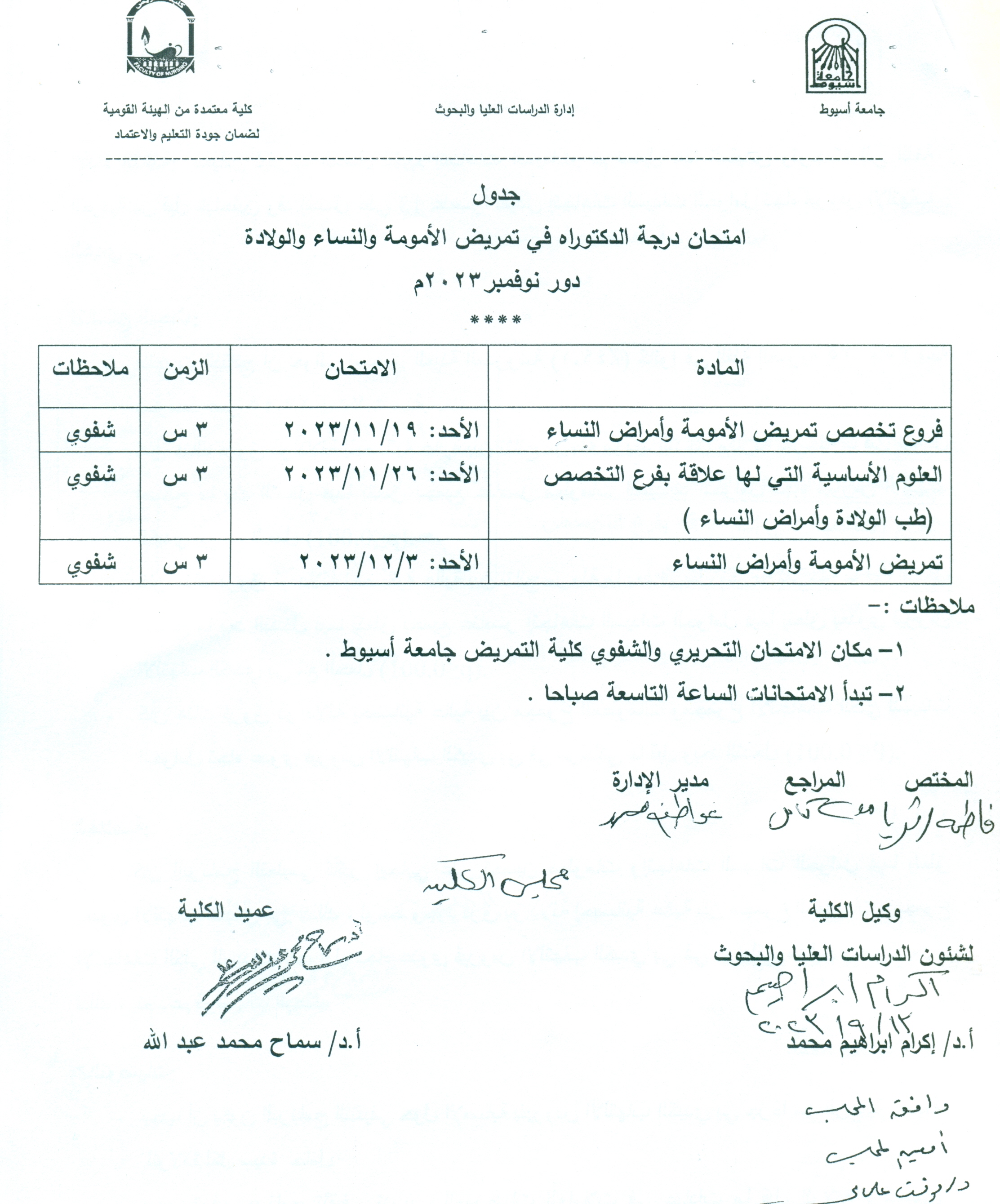 جدول امتحان درجة الدكتوراه في تمريض الأمومة والنساء والولادة دور نوفمبر 2023م