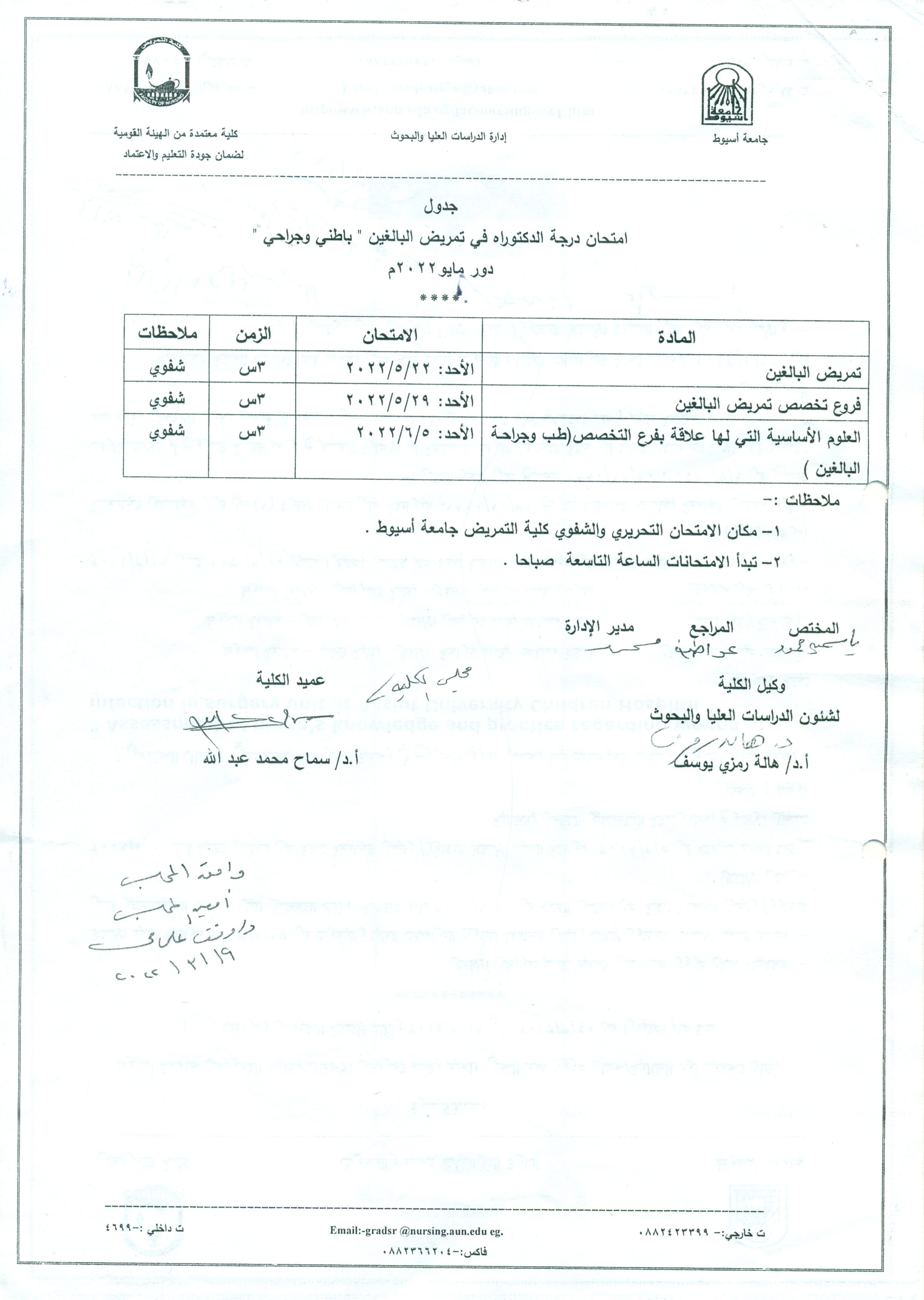 جدول امتحان درجة الدكتوراه فى تمريض البالغين (باطني وجراحي) دور مايو 2022م