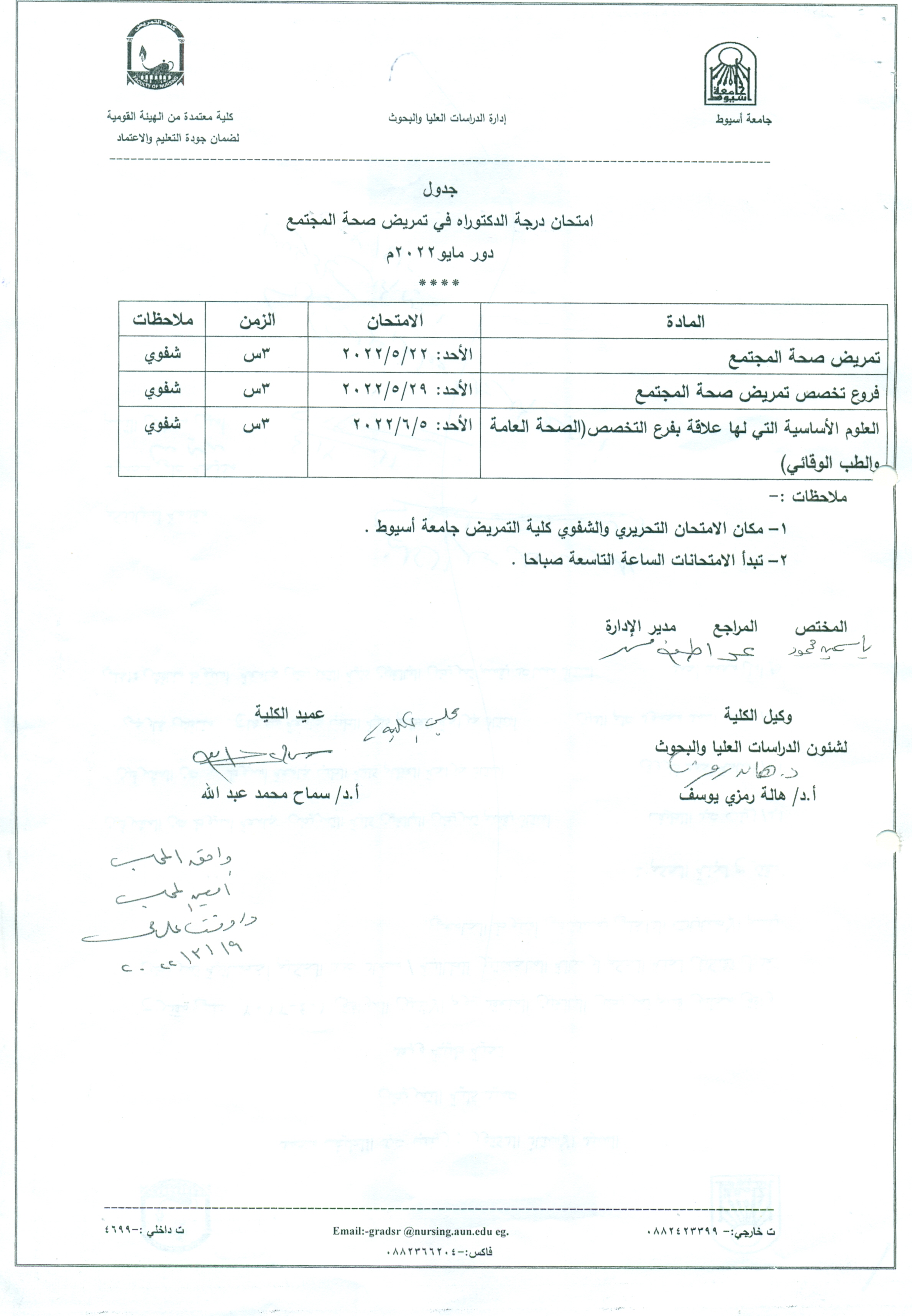 جدول امتحان درجة الدكتوراه فى تمريض صحة المجتمع دور مايو 2022م