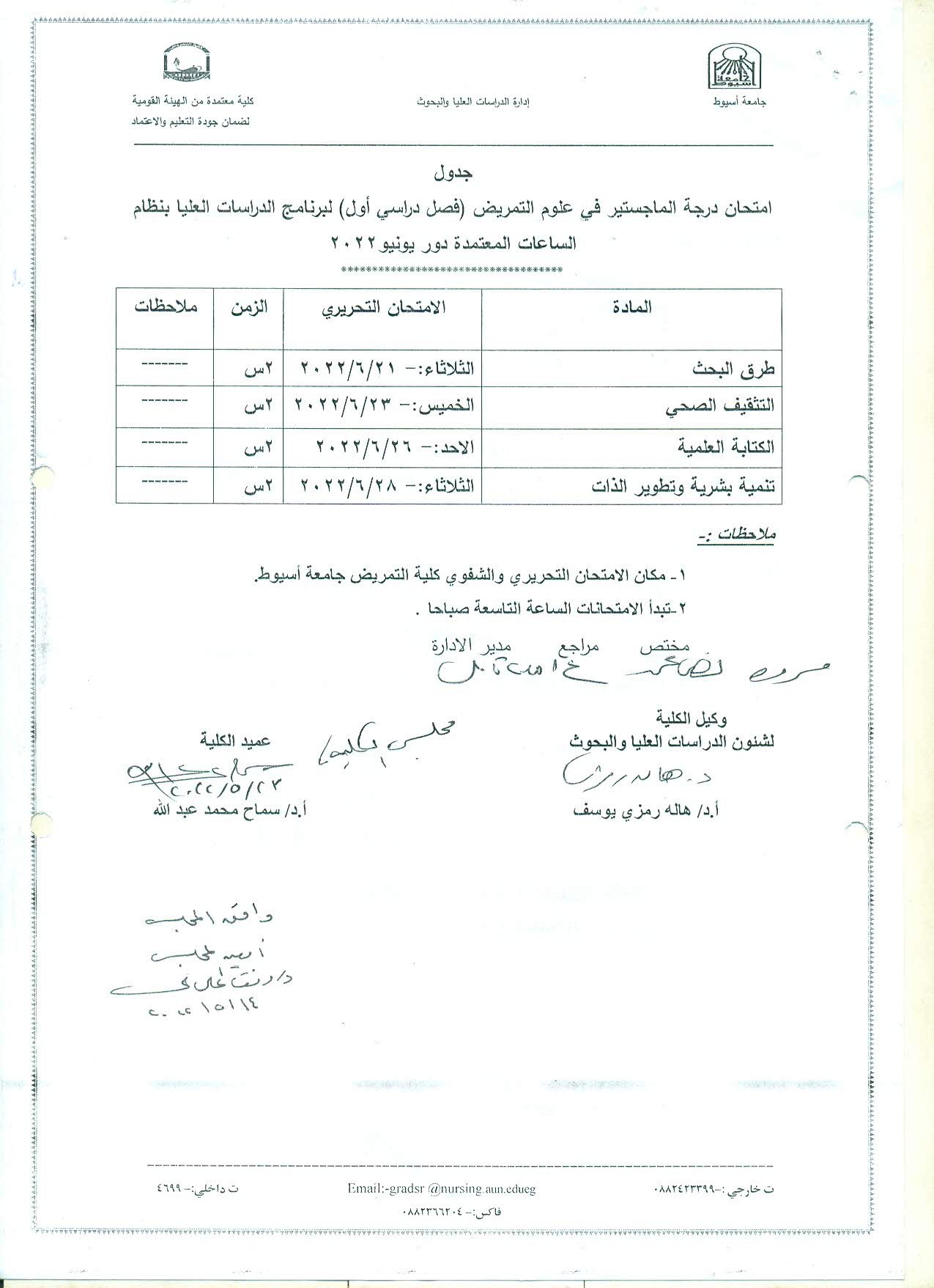 جدول امتحان درجة الماجستير فى علوم التمريض (فصل دراسي أول) لبرنامج الدراسات العليا بنظام الساعات المعتمدة دور يونيو 2022م 29 مايو 2022