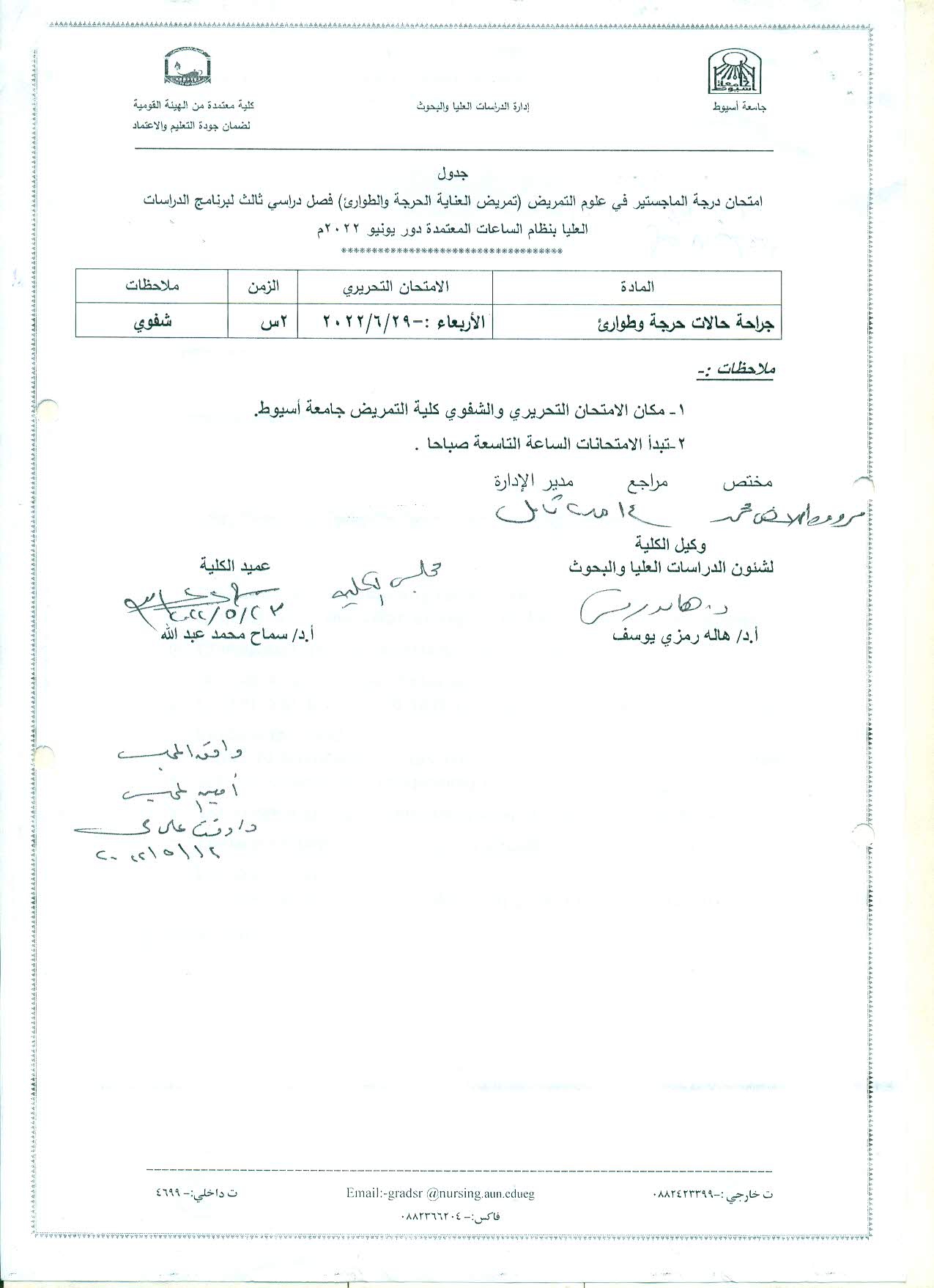 جدول امتحان درجة الماجستير فى علوم التمريض (تمريض العناية الحرجة والطوارئ) فصل دراسي ثالث لبرنامج الدراسات العليا بنظام الساعات المعتمدة دور يونيو 2022م