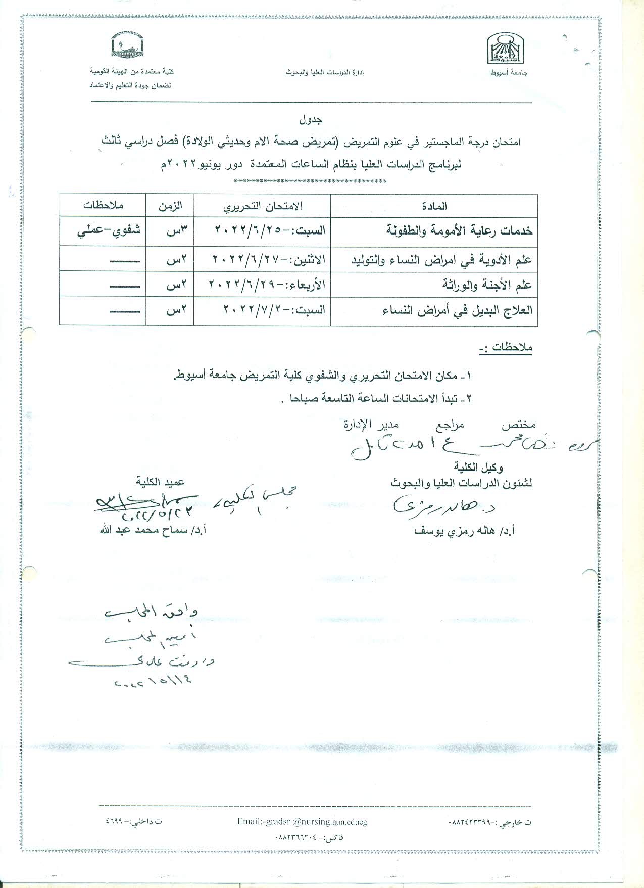 جدول امتحان درجة الماجستير فى علوم التمريض (تمريض صحة الام وحديثي الولادة) فصل دراسي ثالث لبرنامج الدراسات العليا بنظام الساعات المعتمدة دور يونيو 2022م