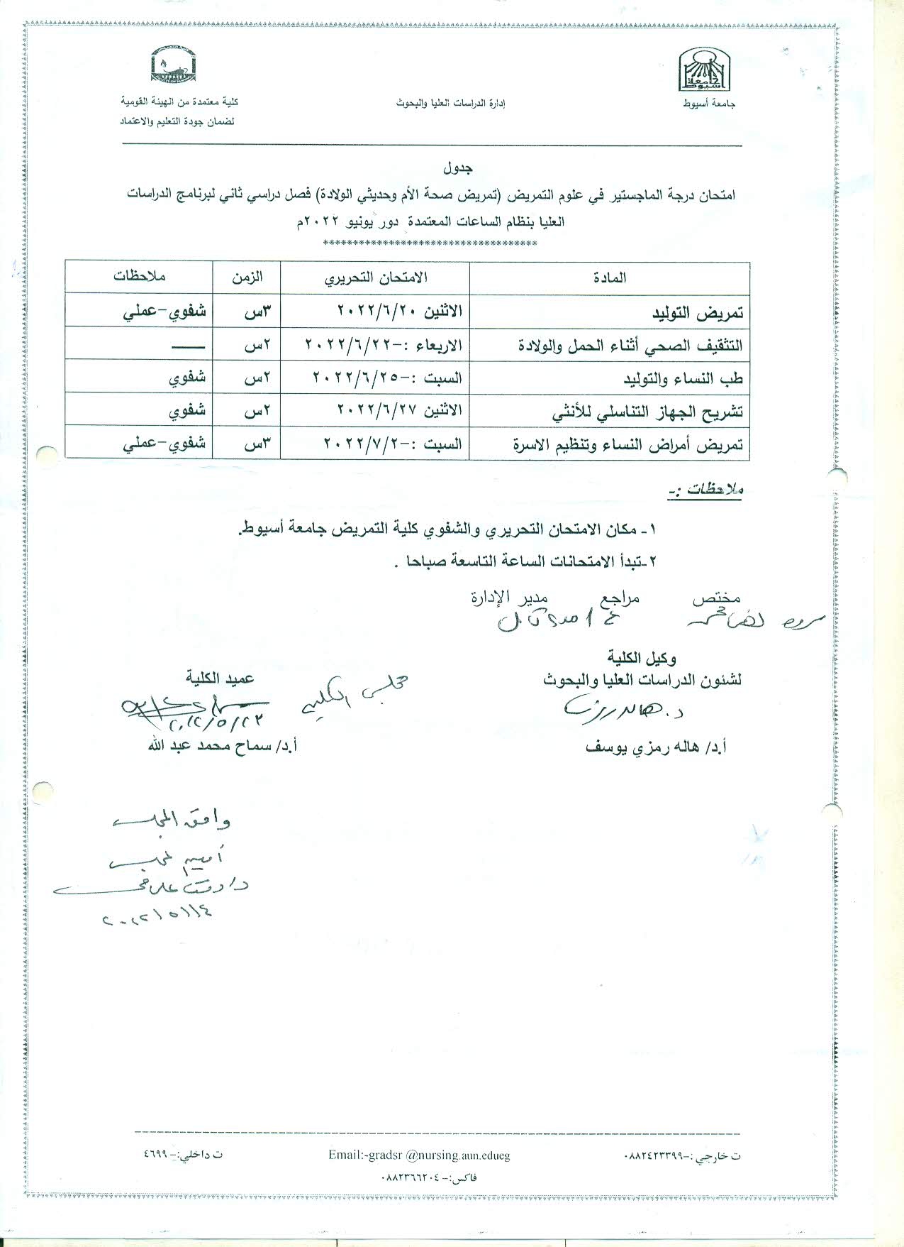جدول امتحان درجة الماجستير فى علوم التمريض (تمريض صحة الأم وحديثى الولادة) فصل دراسي ثانى لبرنامج الدراسات العليا بنظام الساعات المعتمدة دور يونيو 2022م