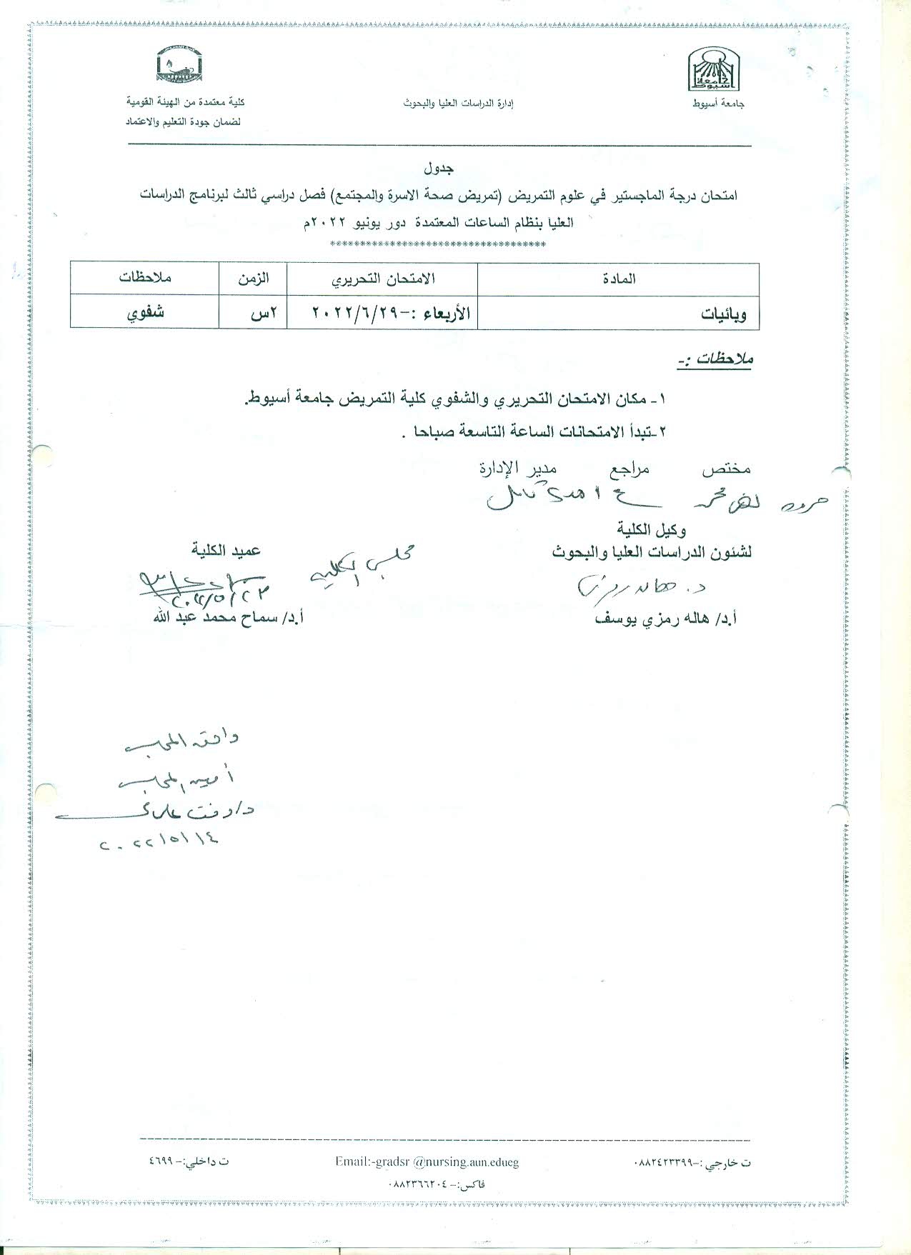 جدول امتحان درجة الماجستير فى علوم التمريض (تمريض صحة الأسرة والمجتمع) فصل دراسي ثالث لبرنامج الدراسات العليا بنظام الساعات المعتمدة دور يونيو 2022م 29 مايو 2022