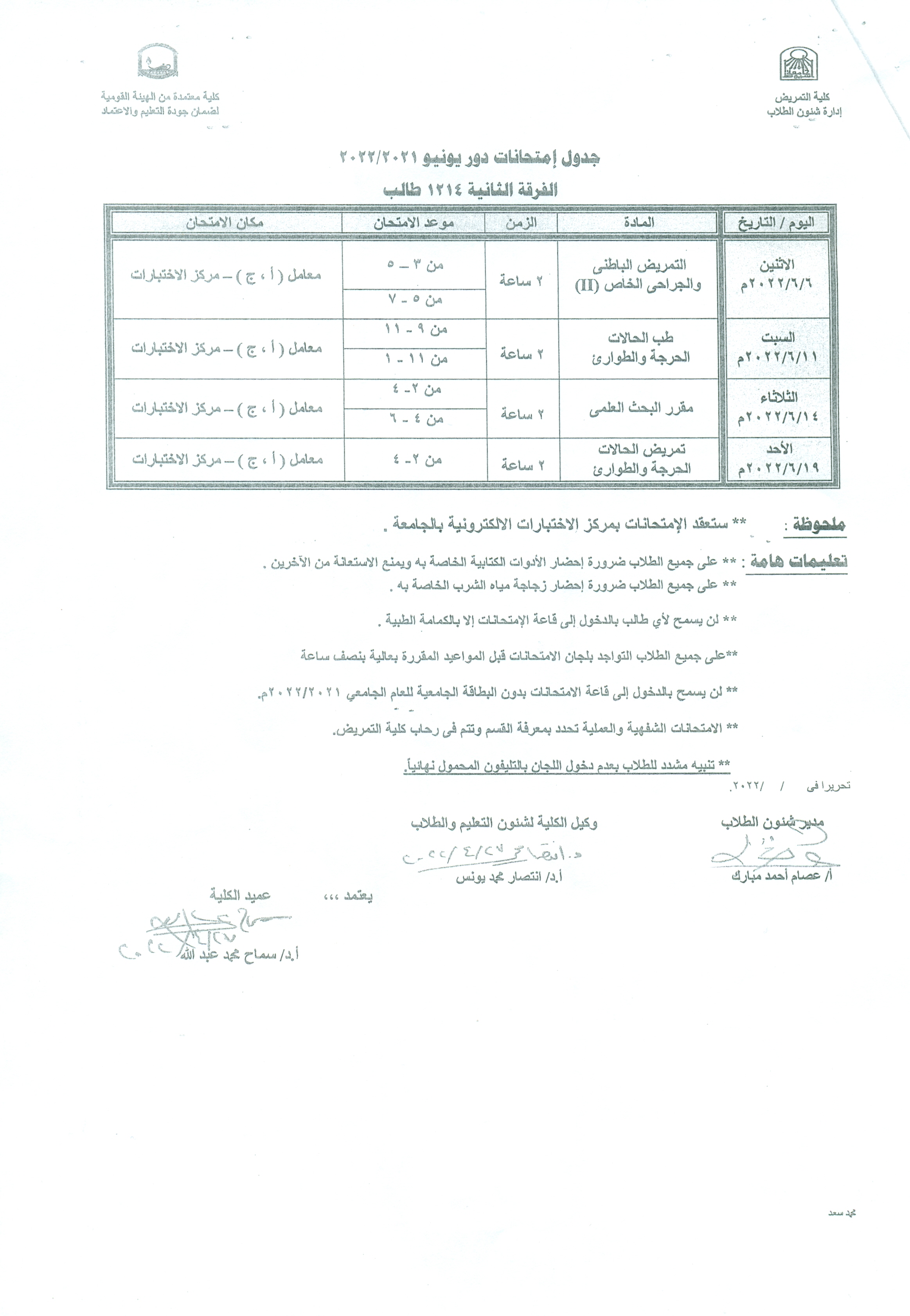 جدول امتحانات الفرقة الثانية دور يونيو 2021 / 2022م