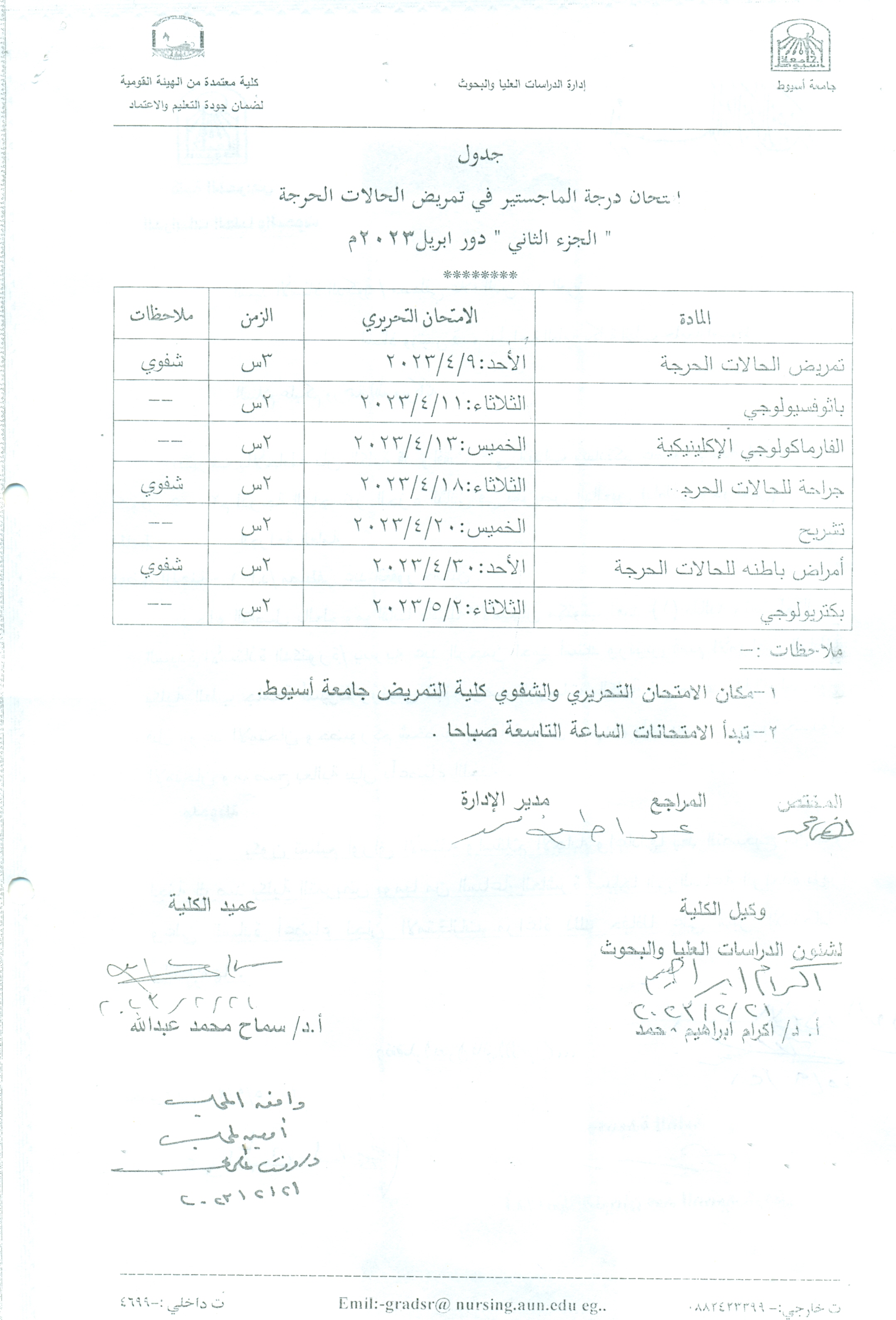 جدول امتحانات درجة الماجستير في تمريض الحالات الحرجة " الجزء الثاني" دور ابريل 2023م