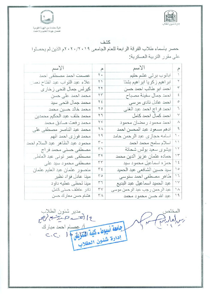 كشف بأسماء طلاب الفرقة الرابعة للعام الجامعي 2019/2020م اللذين لم يحصلوا على مقرر التربية العسكرية 31 مايو 2020 كشف بأسماء طلاب الفرقة الرابعة للعام الجامعي 2019/2020م اللذين لم يحصلوا على مقرر التربية العسكرية