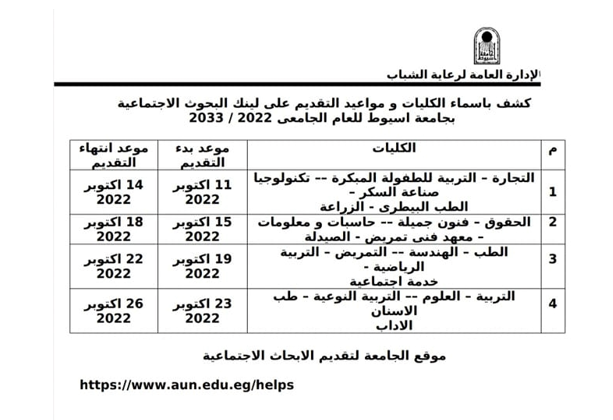 لجميع الطلاب المتقدمين بعمل بحث اجتماعي إليكم المواعيد الخاصة بكل كلية وكذلك موقع الجامعة لتقديم الأبحاث. الرجاء من أبناءنا الطلاب الالتزام بالمواعيد كل طالب هيدخل على الموقع بالرقم القومي
