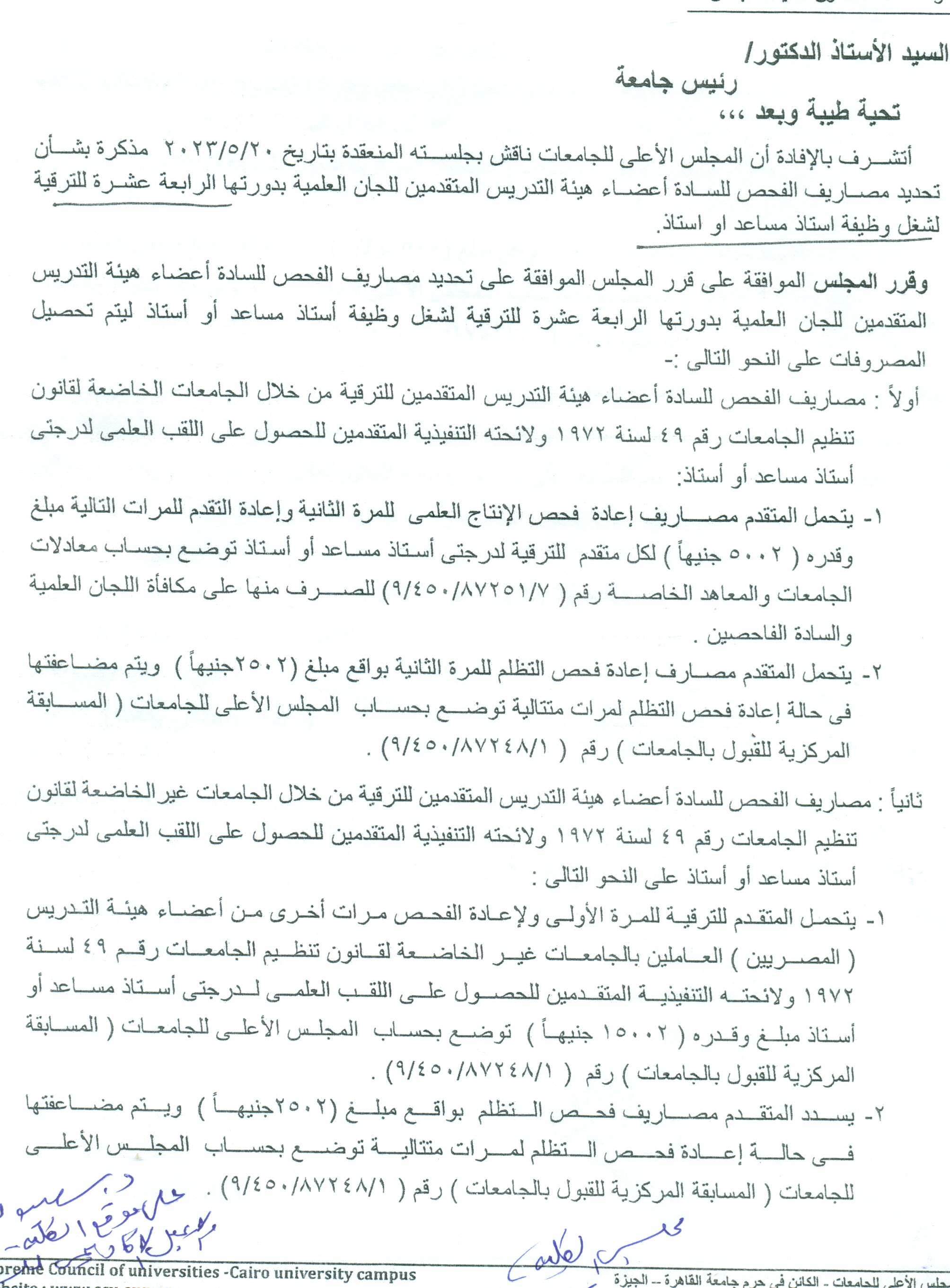 مذكرة بشأن تحديد مصاريف الفحص للسادة أعضاء هيئة التدريس المتقدمين للجان العلمية بدورتها الرابعة عشر للترقية لشغل وظيفة استاذ مساعد أو استاذ 11 يونيو 2023