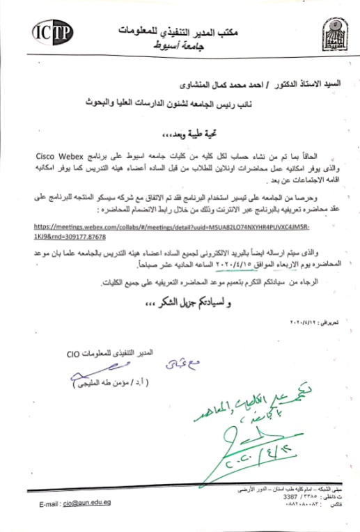 محاضرة تعريفية ببرنامج Cisco Webex والذي يوفر إمكانية عمل محاضرات أونلاين للطلاب وإمكانية إقامة اجتماعات عن بعد 14 أبريل 2020 محاضرة تعريفية ببرنامج Cisco Webex والذي يوفر إمكانية عمل محاضرات أونلاين للطلاب وإمكانية إقامة اجتماعات عن بعد