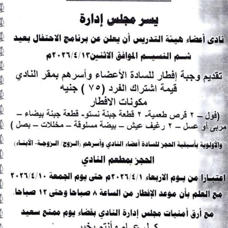 إعلان **** نادي أعضاء هيئة التدريس يعلن عن الاحتفال بعيد شم النسيم الموافق الاثنين 13/4/2026