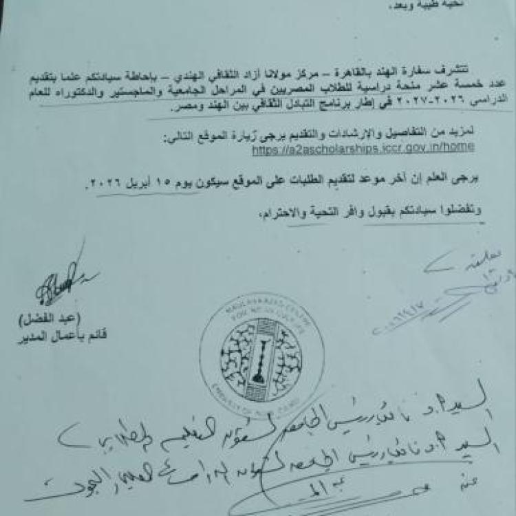 خمسة عشر منحة دراسية للطلاب المصريين في المراحل الجامعية والماجستير والدكتوراه للعام الدراسي 2026-2027 في إطار برنامج التبادل الثقافي بين الهند ومصر