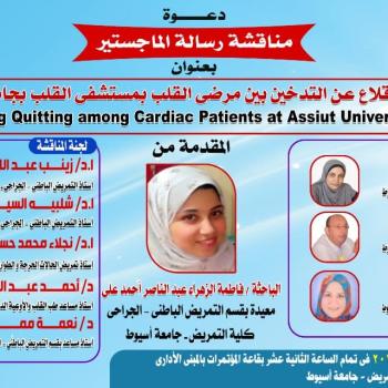 حصول رسالة الماجستير الخاصة بالباحثة/ فاطمة الزهراء عبد الناصر احمد المعيدة بقسم التمريض الباطني والجراحي على تقدير امتياز