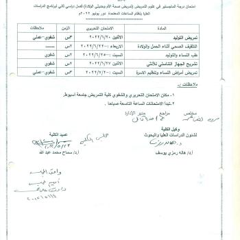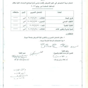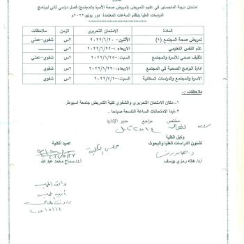 جدول امتحان درجة الماجستير فى علوم التمريض (تمريض صحة الأسرة والمجتمع) فصل دراسي ثانى لبرنامج الدراسات العليا بنظام الساعات المعتمدة دور يونيو 2022م