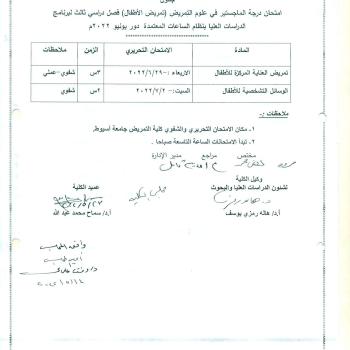 جدول امتحان درجة الماجستير فى علوم التمريض (تمريض الأطفال) فصل دراسي ثالث لبرنامج الدراسات العليا بنظام الساعات المعتمدة دور يونيو 2022م