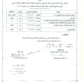 جدول امتحان درجة الماجستير فى علوم التمريض (تمريض العناية الحرجة والطوارئ) فصل دراسي ثانى لبرنامج الدراسات العليا بنظام الساعات المعتمدة دور يونيو 2022م