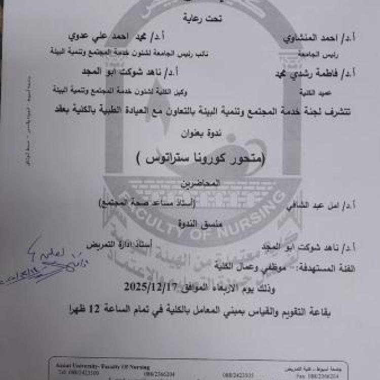 نظمت اليوم كلية التمريض جامعة أسيوط ورشة عمل استعداداً لمرثاون امتحانات منتصف الفصل الدراسي للعام الجامعي 2025ـ2026م ورشة عمل بعنوان…