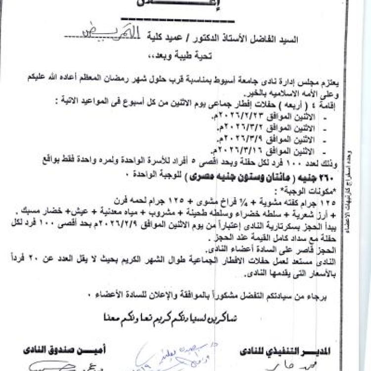 إعلان يعتزم مجلس إدارة نادي اسيوط بمناسبة قرب حلول شهر رمضان المبارك المعظم إقامة 4 حفلات إفطار جماعي يوم الأثنين من كل اسبوع