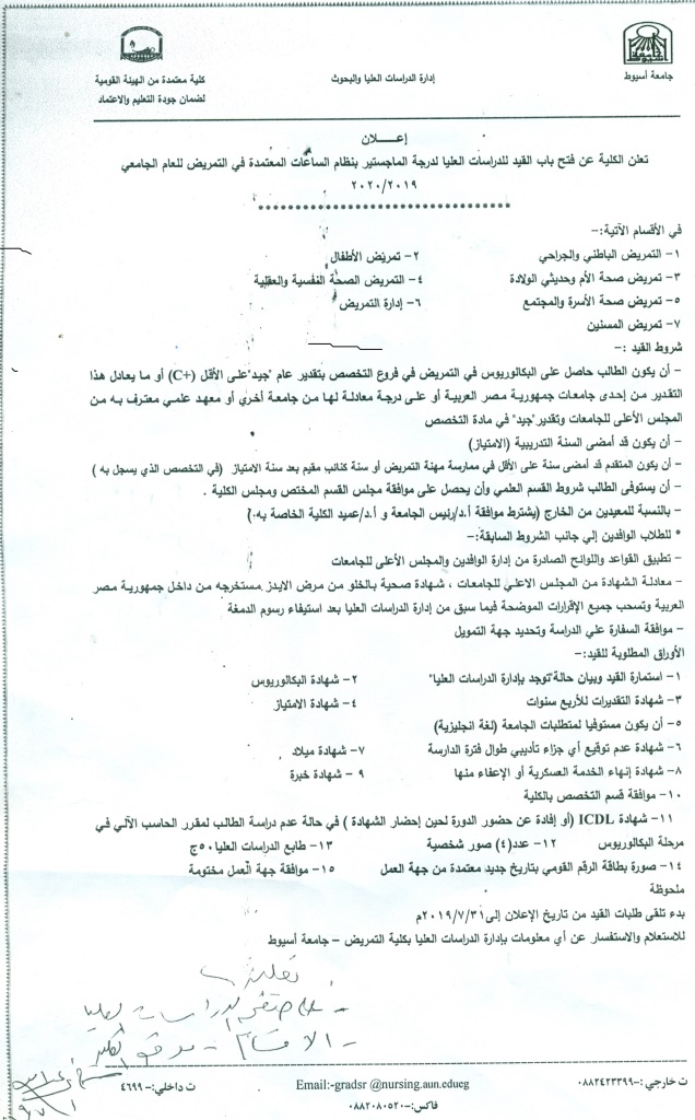 فتح باب القيد للدراسات العليا لدرجة الماجستير بنظام الساعات المعتمدة فى التمريض للعام الجامعي 2019/2020 4 يوليو 2019 فتح باب القيد للدراسات العليا لدرجة الماجستير بنظام الساعات المعتمدة فى التمريض للعام الجامعي 2019/2020