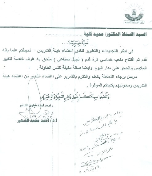 افتتاح ملعب خماسي كرة قدم (نجيل صناعي) بنادي أعضاء هيئة التدريس 12 مايو 2019 افتتاح ملعب خماسي كرة قدم (نجيل صناعي) بنادي أعضاء هيئة التدريس