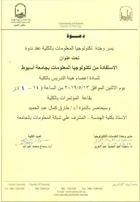 دعوة لحضور ندوة تحت عنوان "الاستفادة من تكنولوجيا المعلومات بجامعة أسيوط" للسادة أعضاء هيئة التدريس 7 مايو 2019 دعوة لحضور ندوة تحت عنوان "الاستفادة من تكنولوجيا المعلومات بجامعة أسيوط" للسادة أعضاء هيئة التدريس