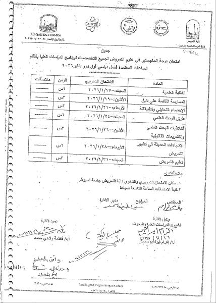 جدول امتحان الماجستير في علوم التمريض لجميع التخصصات لبرنامج الدراسات العليا بنظام الساعات المعتمدة فصل دراسي أول دور يناير 2026