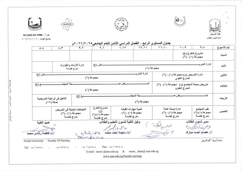 جدول المستوي الرابع الفصل الدراسي الثامن للعام الجامعي 2025-2026