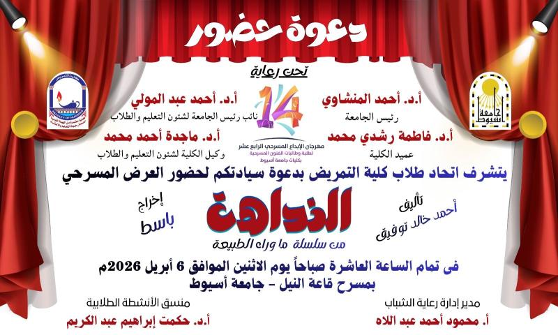 موعدنا مع العرض المسرحى (النداهة) لفريق مسرح كلية التمريض يوم الاثنين الموافق ٢٠٢٦/٤/٦م الساعة العاشرة صباحاً على مسرح قاعة النيل بجامعة اسيوط الدعوة عامة... (حضوركم تشريف لنا). 📌 #إعلام_كلية_التمريض_جامعة_أسيوط