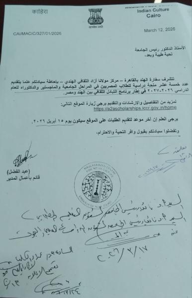 خمسة عشر منحة دراسية للطلاب المصريين في المراحل الجامعية والماجستير والدكتوراه للعام الدراسي 2026-2027 في إطار برنامج التبادل الثقافي بين الهند ومصر 8 أبريل 2026