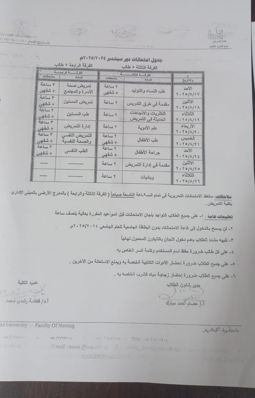 جدول امتحانات دور ستمبر 2024- 2025م