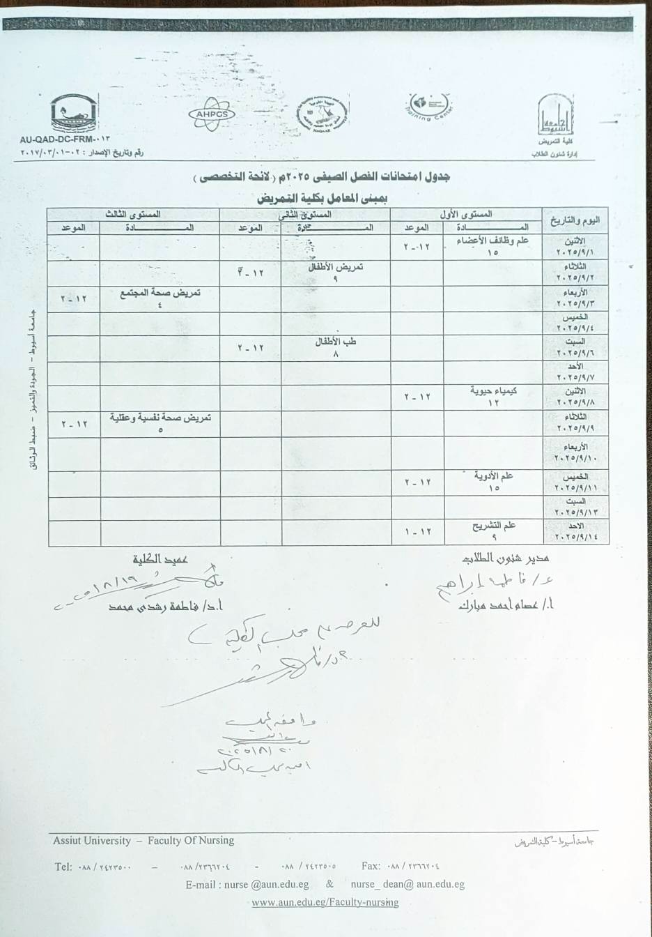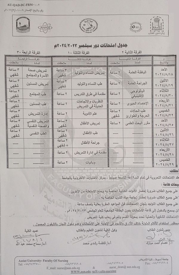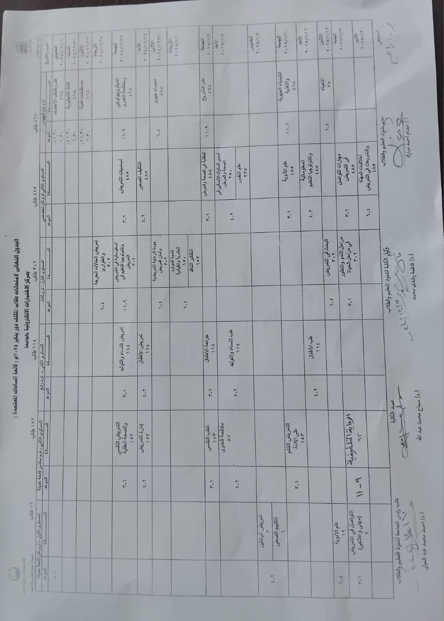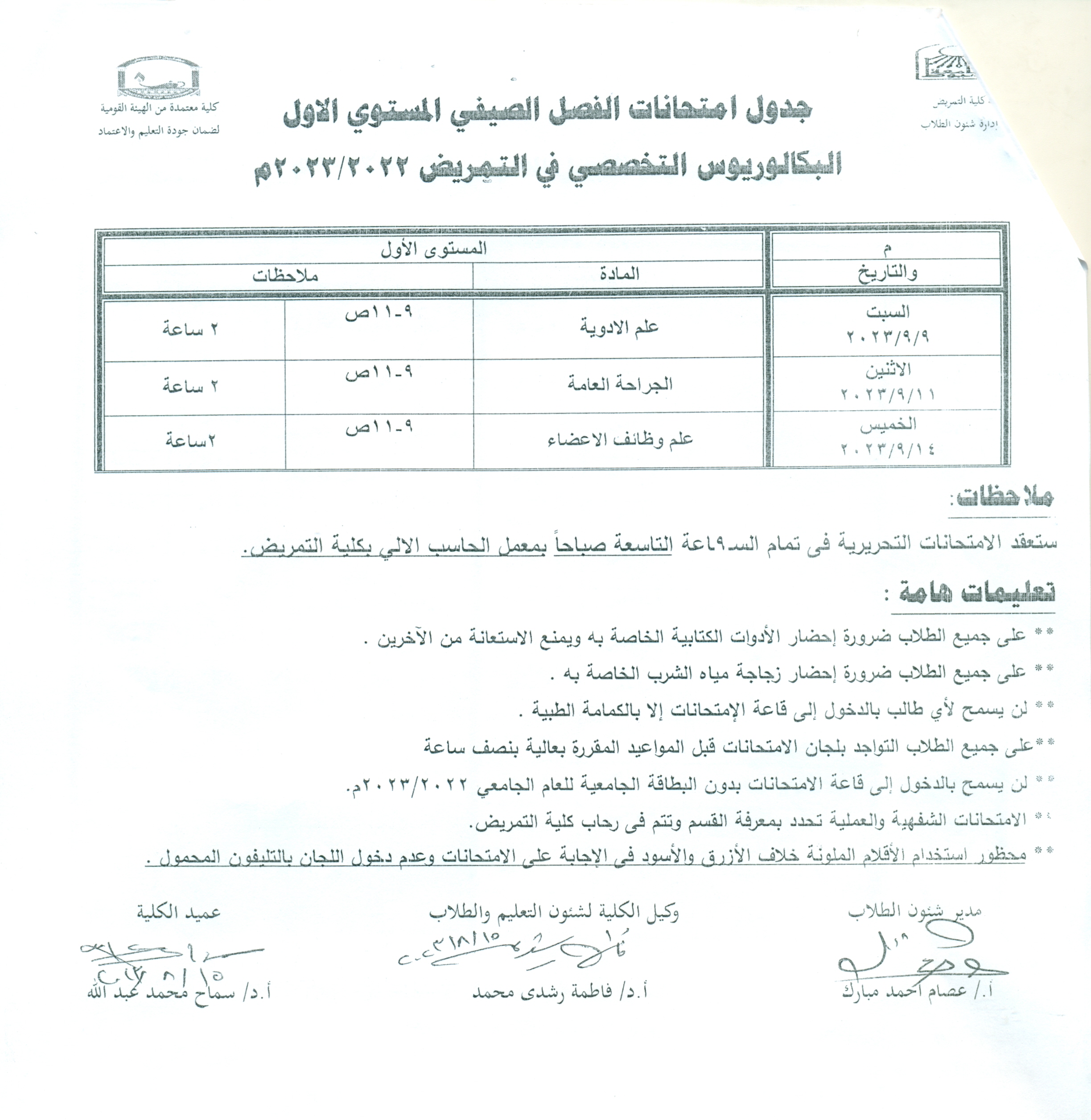 جدول امتحانات الفصل الصيفي المستوي الاول البكالوريوس التخصصي في التمريض 2022/2023م