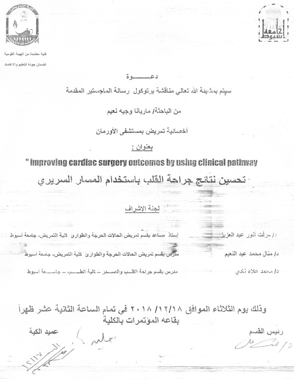 سوف يتم بمشيئة الله تعالى اجتماع لجنة الدراسات العليا برئاسة السيدة الأستاذ الدكتور/ ميمي محمد مكاوي - وكيل الكلية للدراسات العليا والبحوث. وذلك يوم الاحد الموافق 9/12/2018م بكلية التمريض - جامعة أسيوط.