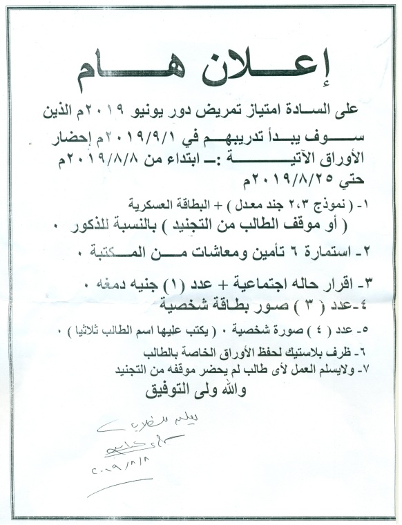 وذلك يوم الاثنين الموافق 19/8/2019م في تمام الساعة (12) ظهراً بقاعة المؤتمرات بالمبنى الإداري بالكلية