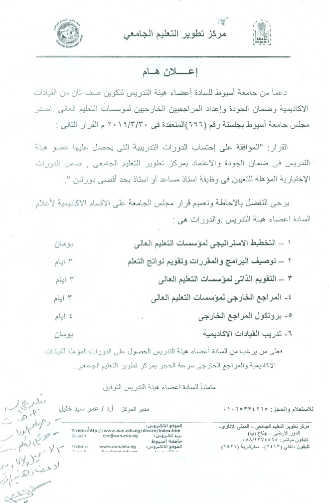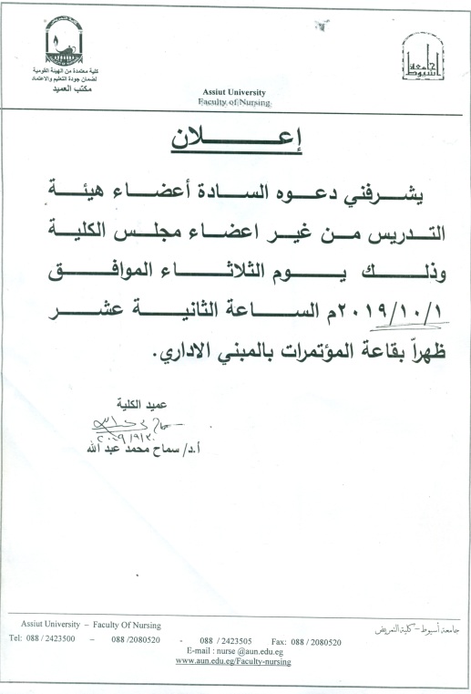 سوف يتم بمشيئة الله تعالى اجتماع مجلس الكلية لشهر سبتمبر يوم الاثنين الموافق 16/9/2019م في تمام الساعة العاشرة صباحاً بقاعة مجلس الكلية بمبنى المعامل بكلية التمريض - جامعة أسيوط