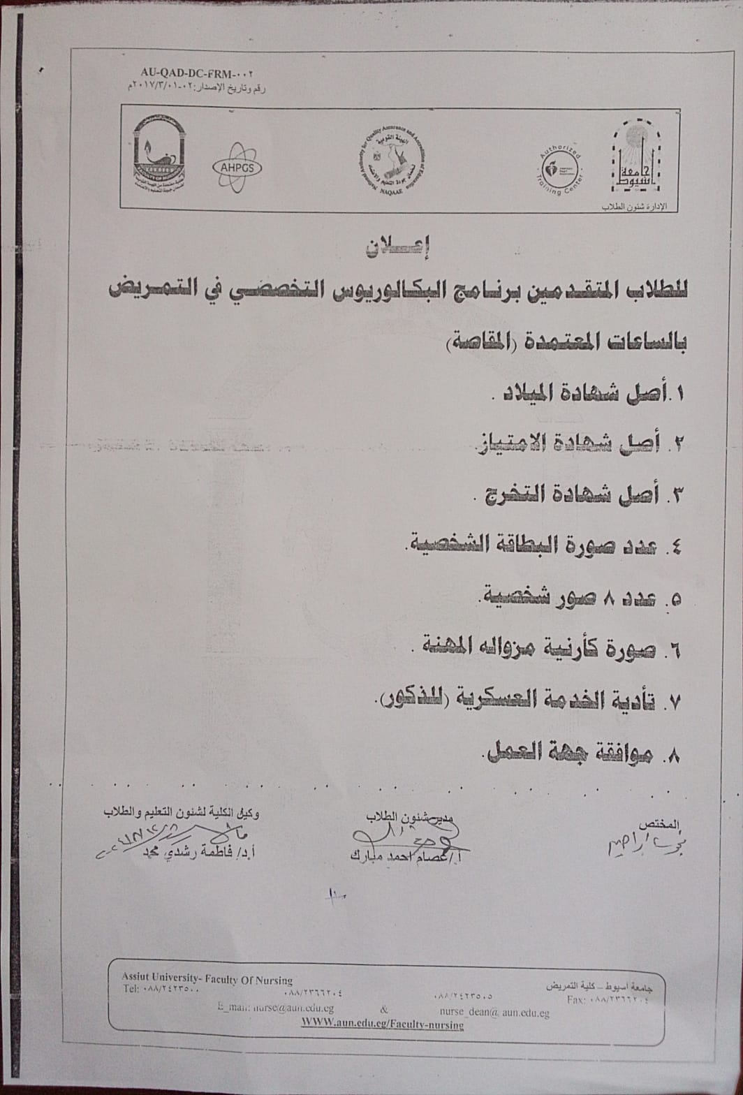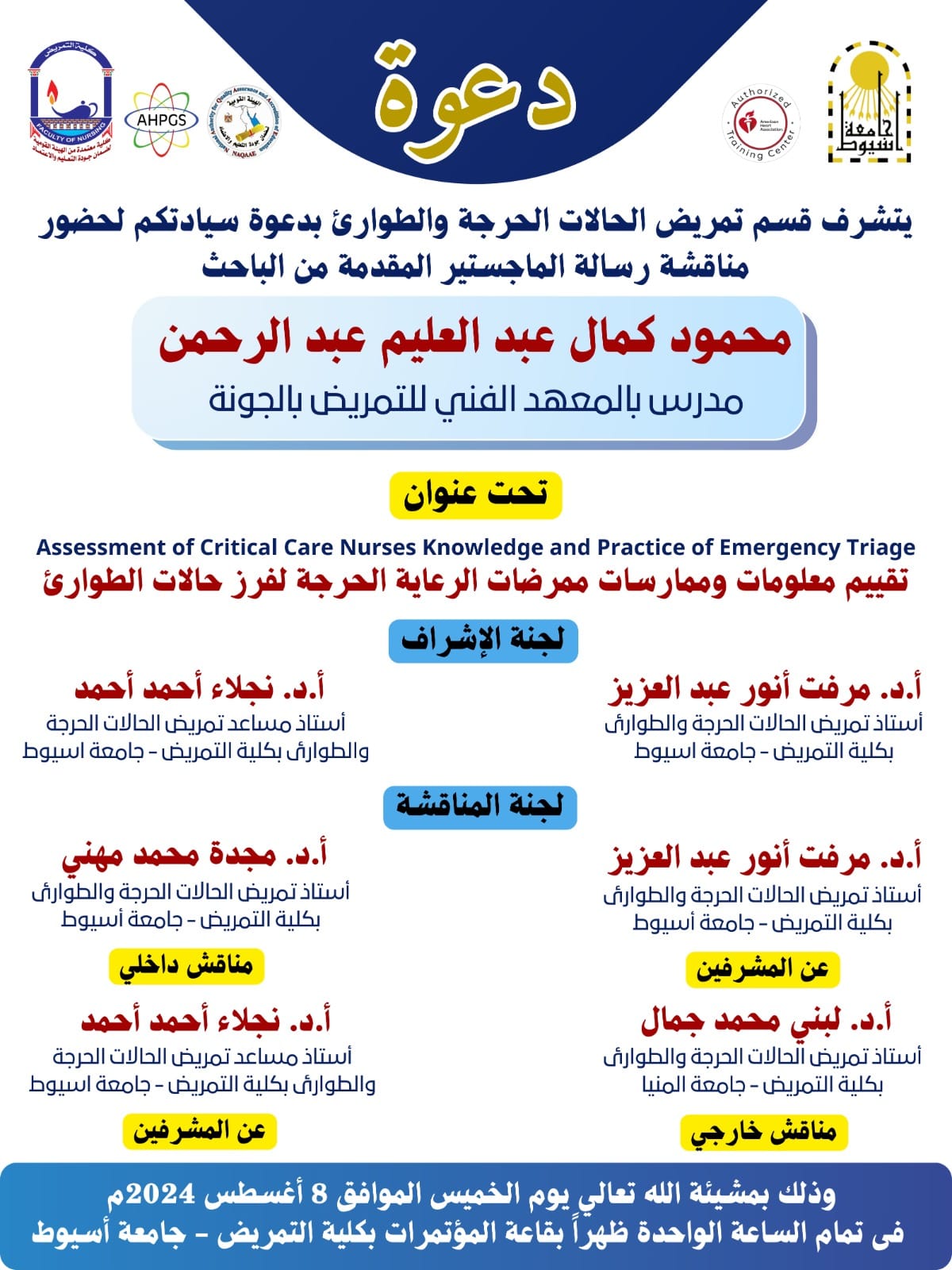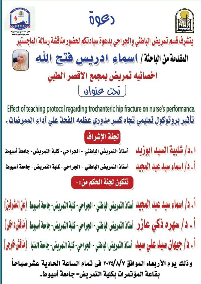 وذلك يوم الخميس الموافق 8-8-2024م في تمام الساعة 1 ظهراً بقاعة المؤتمرات  بالمبني الاداري بكلية التمريض - جامعة اسيوط
