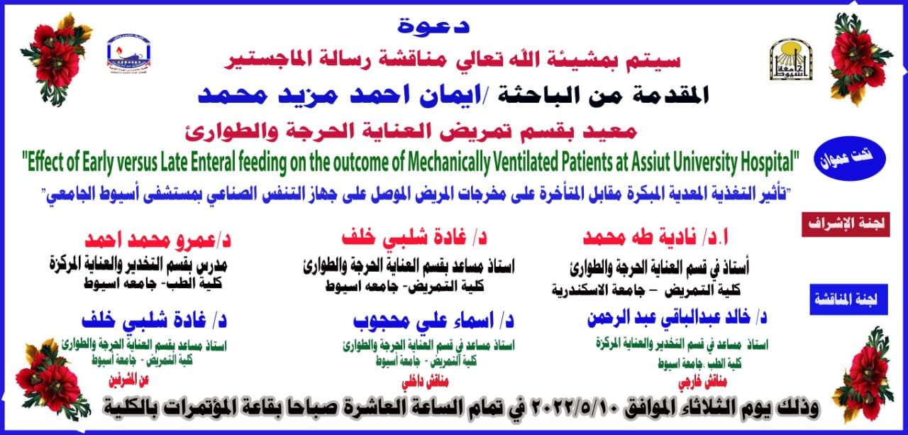 (تاثير التغزية المعدية المبكرة مقابل المتاخرة علي مخرجات المريض علي جهاز التنفس الصناعي بمستشفي اسيوط الجامعي)