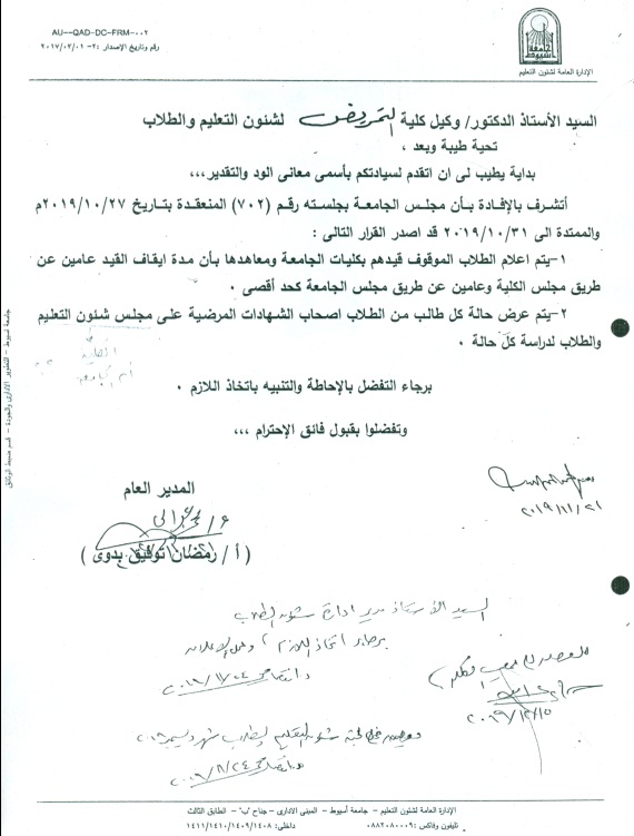 قرار مجلس الجامعة الخاص بالطلاب الموقوف قيدهم وأصحاب الشهادات المرضية 16 ديسمبر 2019 قرار مجلس الجامعة الخاص بالطلاب الموقوف قيدهم وأصحاب الشهادات المرضية