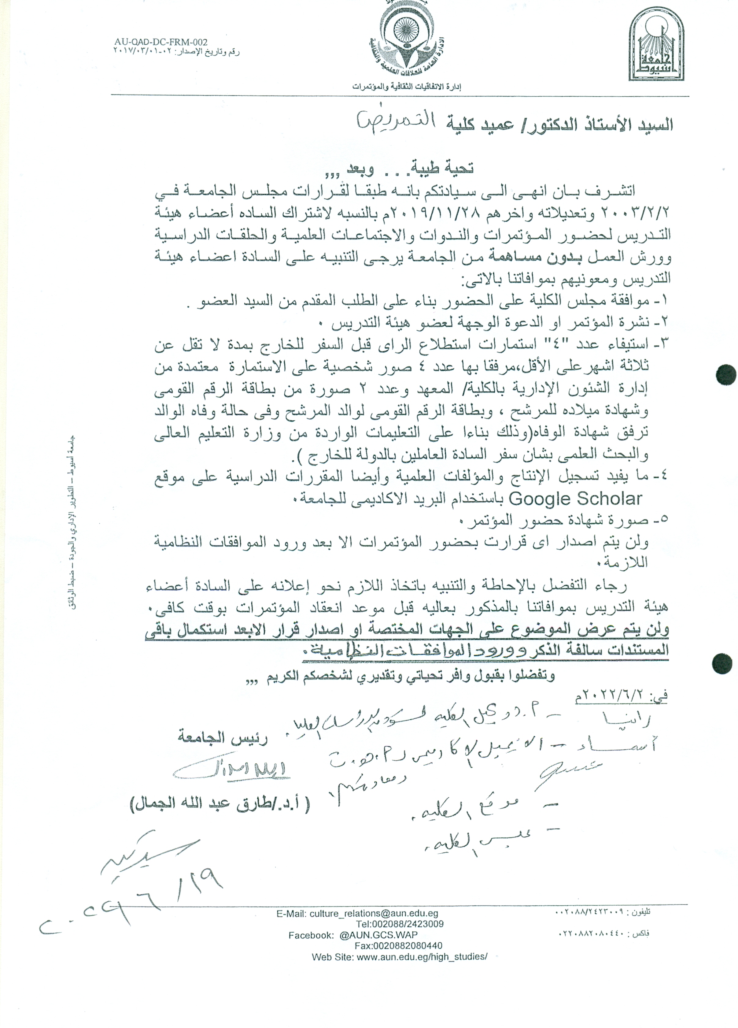 قرار مجلس الجامعة بالنسبة لمتطلبات أشتراك السادة أعضاء هيئة التدريس لحضور المؤتمرات والندوات والاجتماعات العلمية والحلقات الدراسية وورش العمل بدون مساهمة من الجامعة
