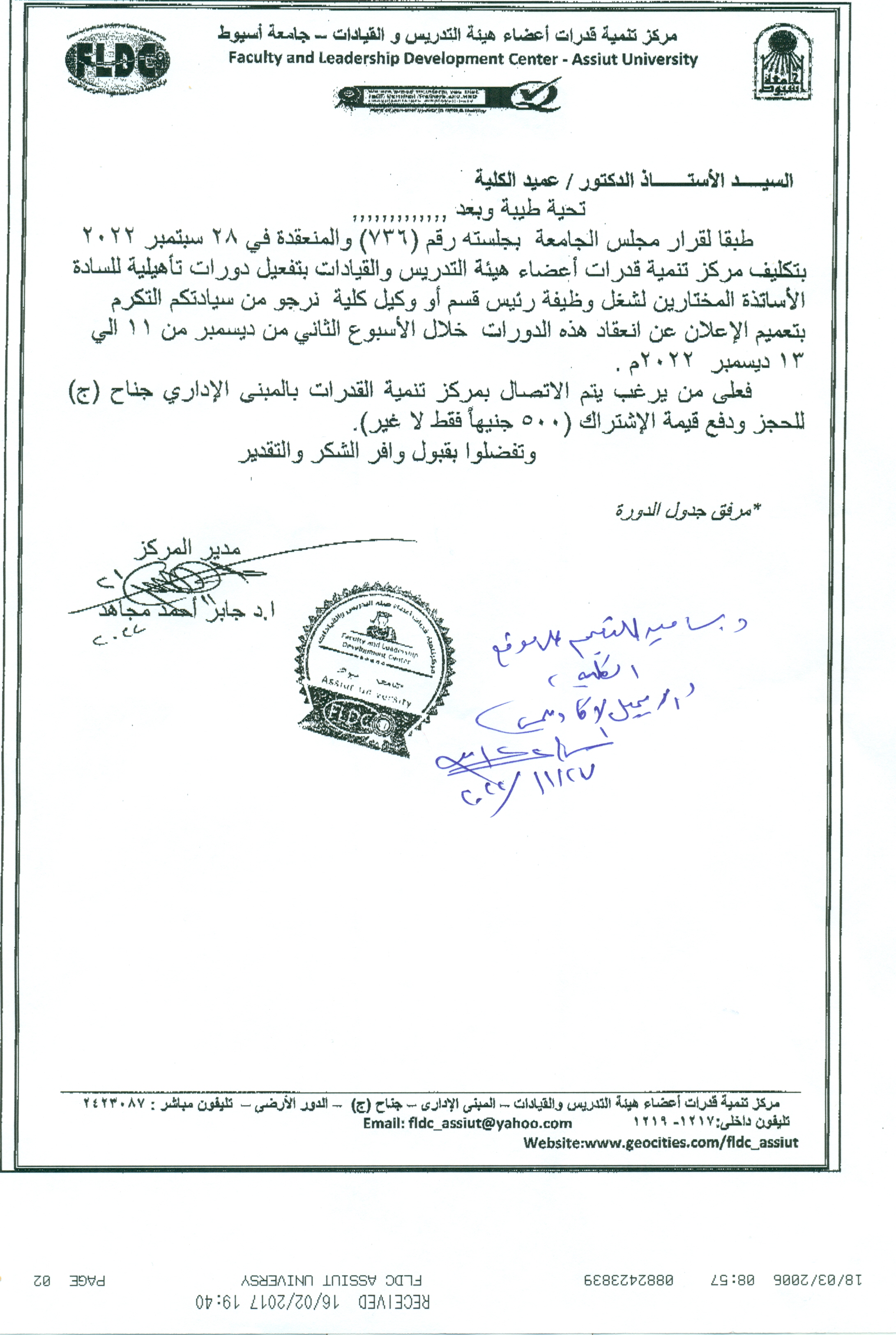 قرار مجلس الجامعة بجلسته رقم (736) المنعقد فى 2022/9/28م بتكليف مركز تنمية قدرات أعضاء هيئة التدريس والقيادت بتفعيل دورات تأهيلية 28 نوفمبر 2022 للسادة الأساتذة المختارين لشغل وظيفة رئيس قسم أو وكيل كلية