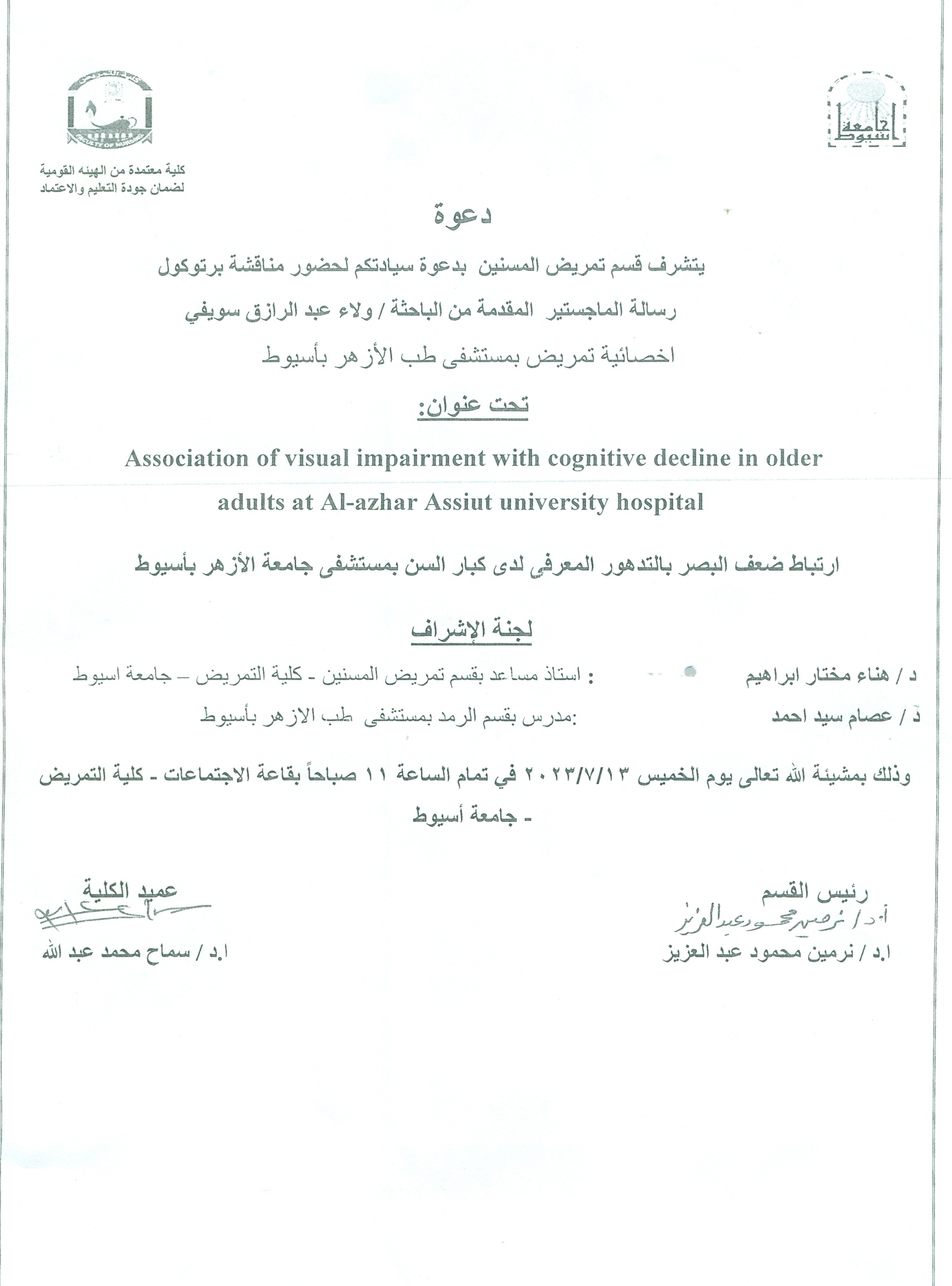وذلك يوم الخميس الموافق 13-7-2023م فى تمام الساعة الحادية عشر صباحا بقاعة المؤتمرات بالمبني الإداري - كلية التمريض - جامعة أسيوط